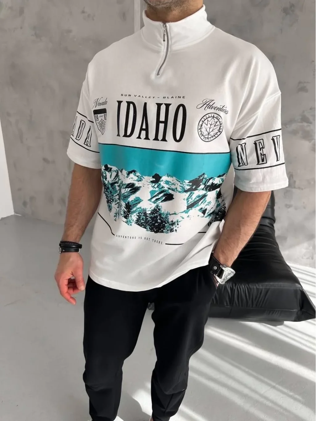 Unisex Baskılı Yarım Fermuarlı T-Shirt - Beyaz