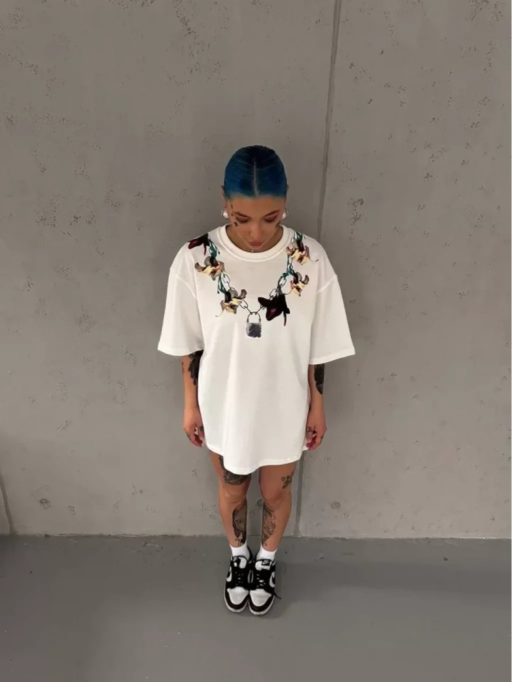 Unisex Bisiklet Yaka Baskılı Oversize T-Shirt - Beyaz