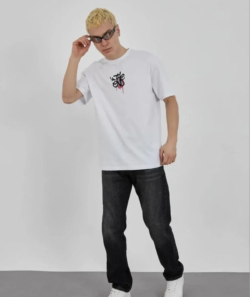 Unisex Bisiklet Yaka Baskılı Oversize T-Shirt - Beyaz