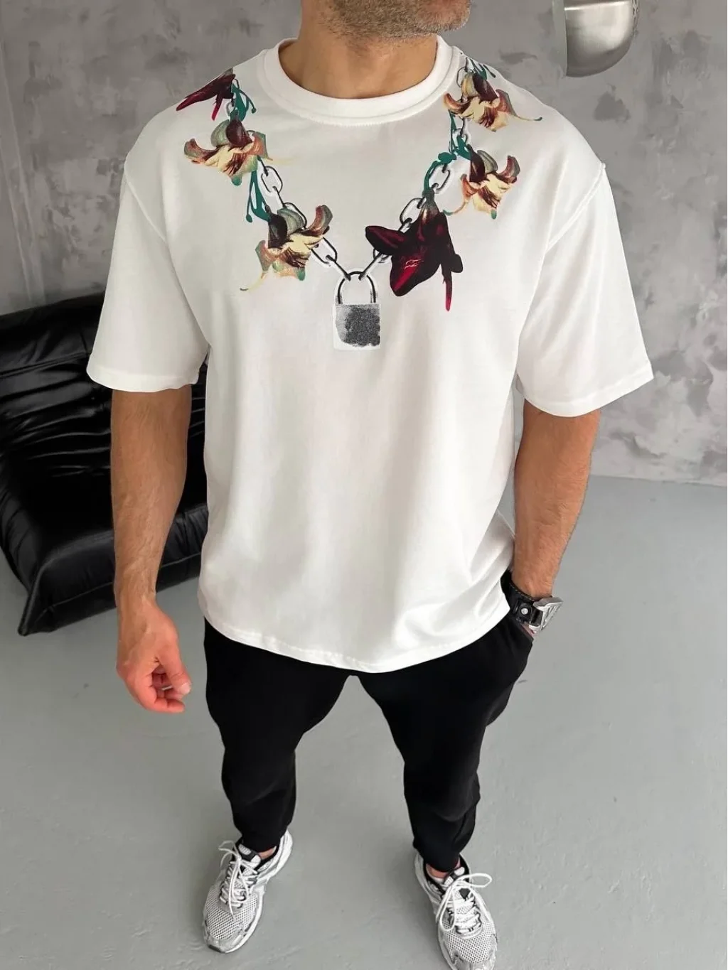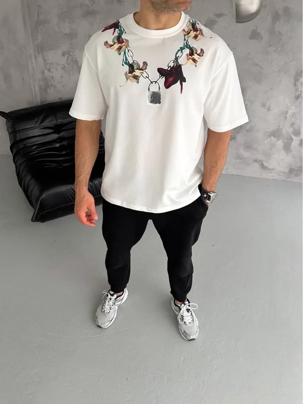 Unisex Bisiklet Yaka Baskılı Oversize T-Shirt - Beyaz