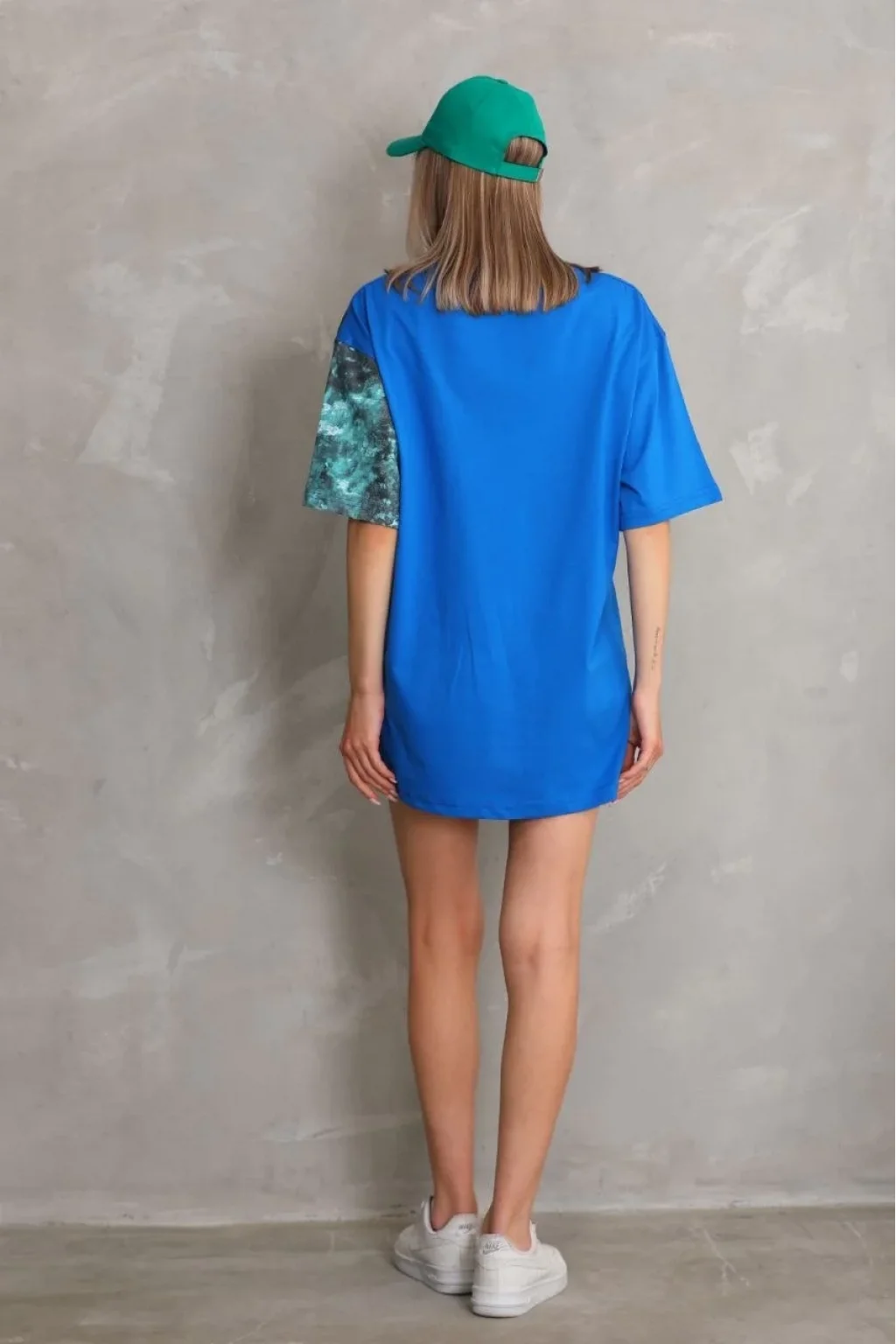 Unisex Bisiklet Yaka Baskılı Oversize T-Shirt - Mavi