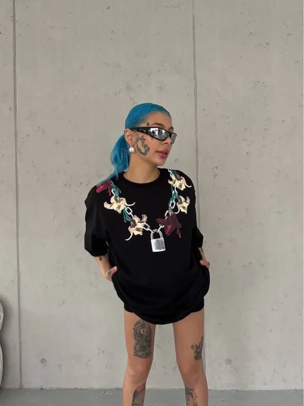 Unisex Bisiklet Yaka Baskılı Oversize T-Shirt - Siyah