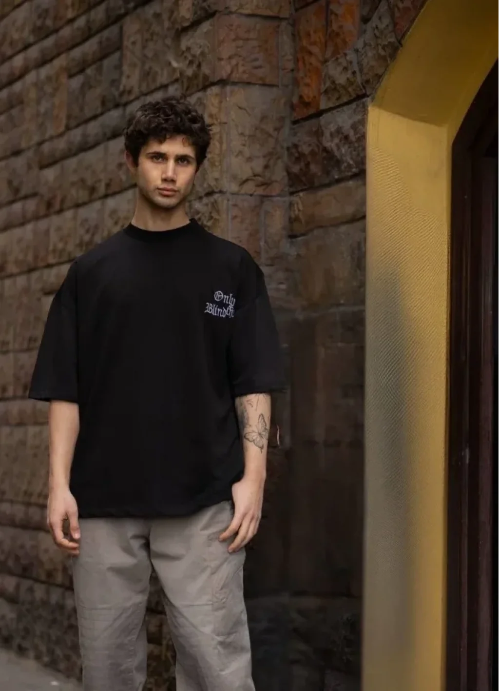 Unisex Bisiklet Yaka Baskılı Oversize T-Shirt - Siyah