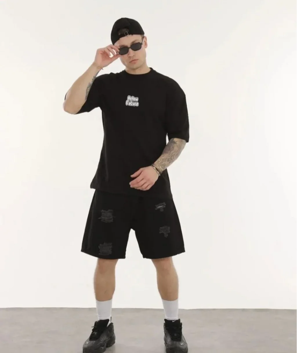 Unisex Bisiklet Yaka Baskılı Oversize T-Shirt - Siyah