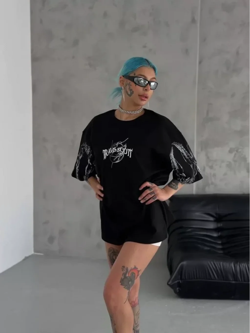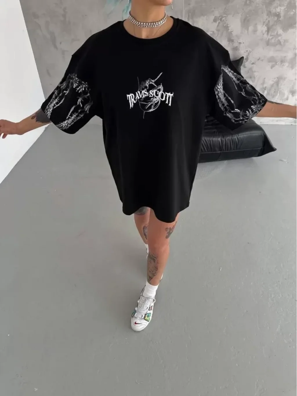 Unisex Bisiklet Yaka Baskılı Oversize T-Shirt - Siyah