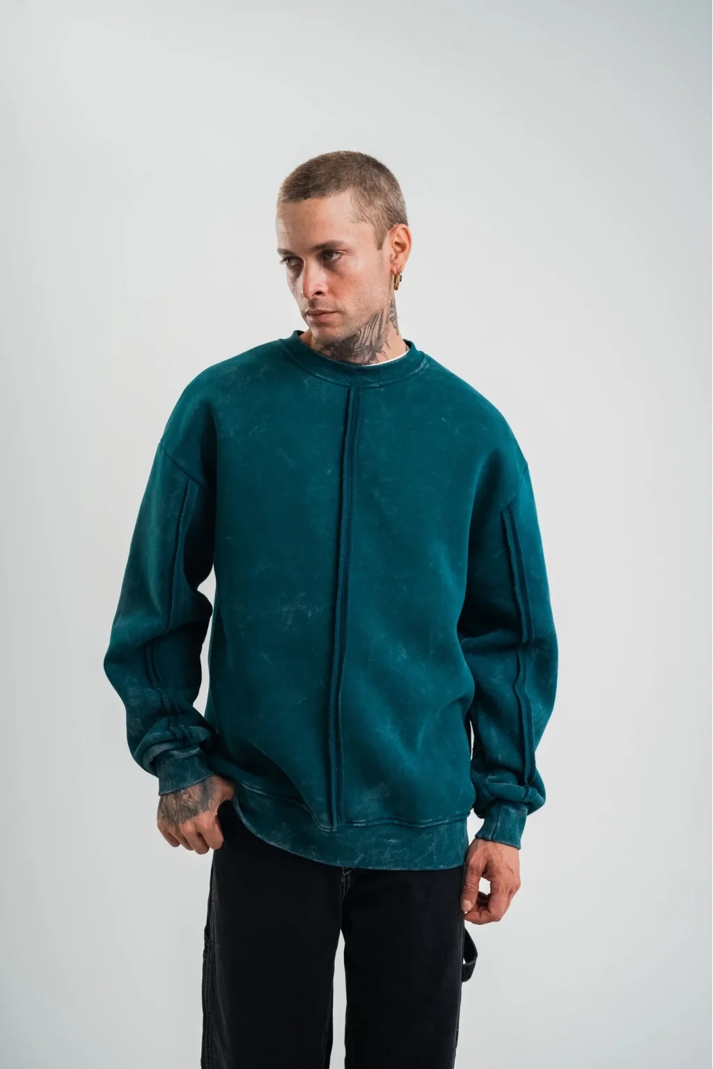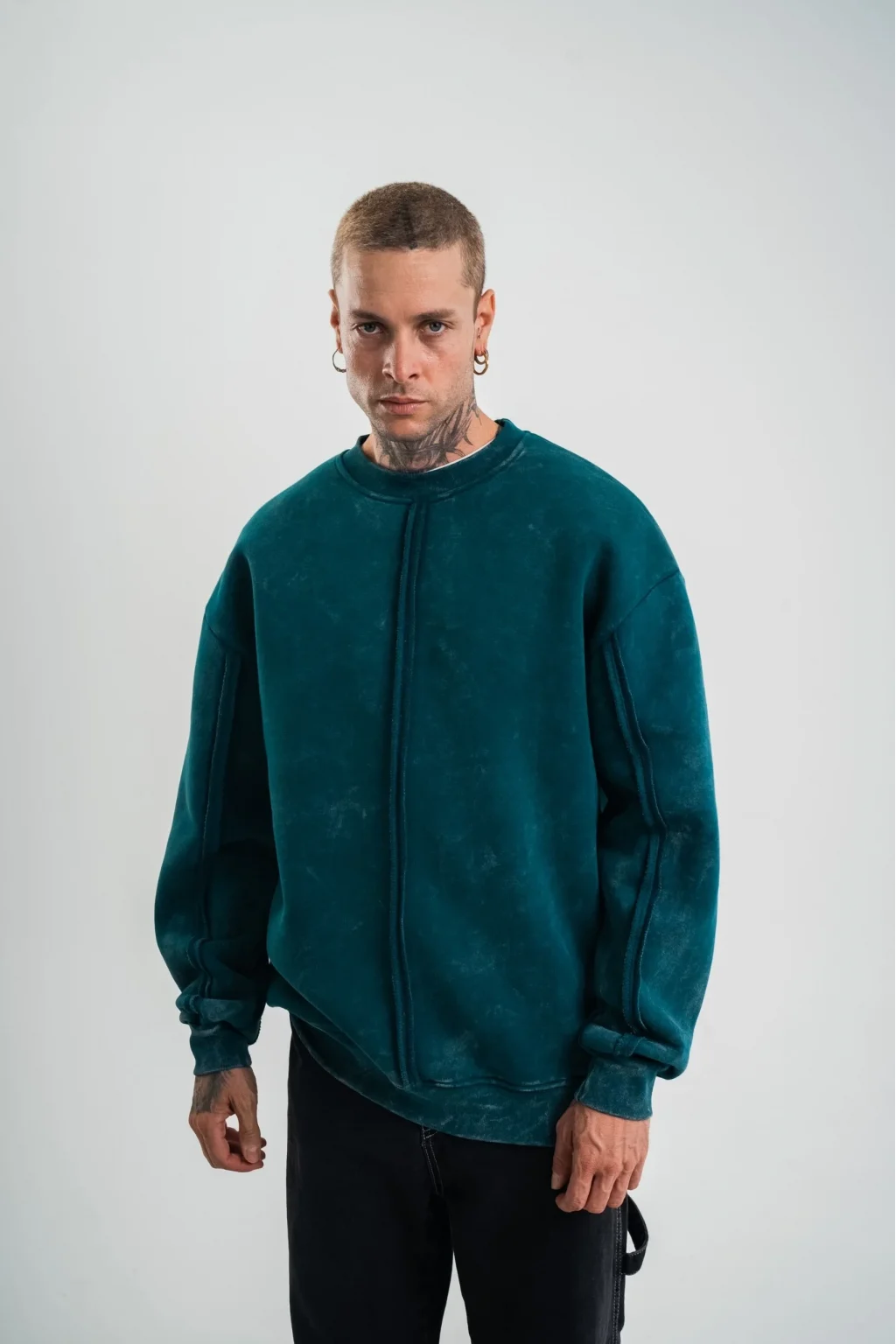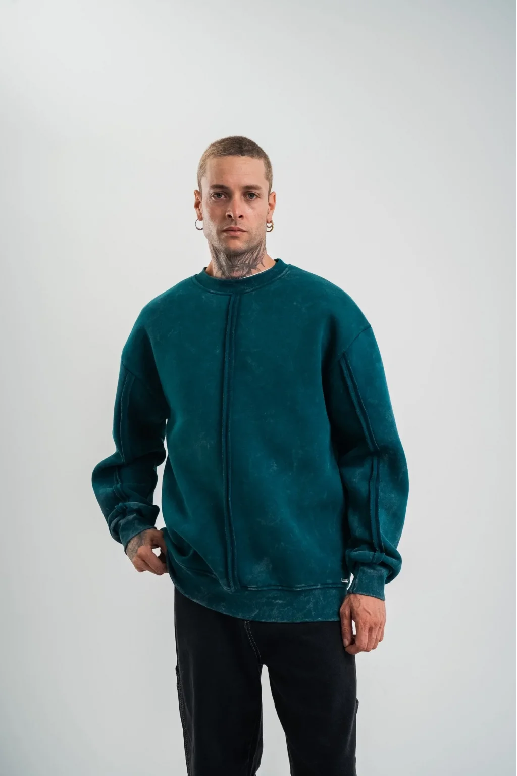 Unisex Bisiklet Yaka Özel Pis Dikişli Yıkamalı SweatShirt - Koyu Deniz Yeşili
