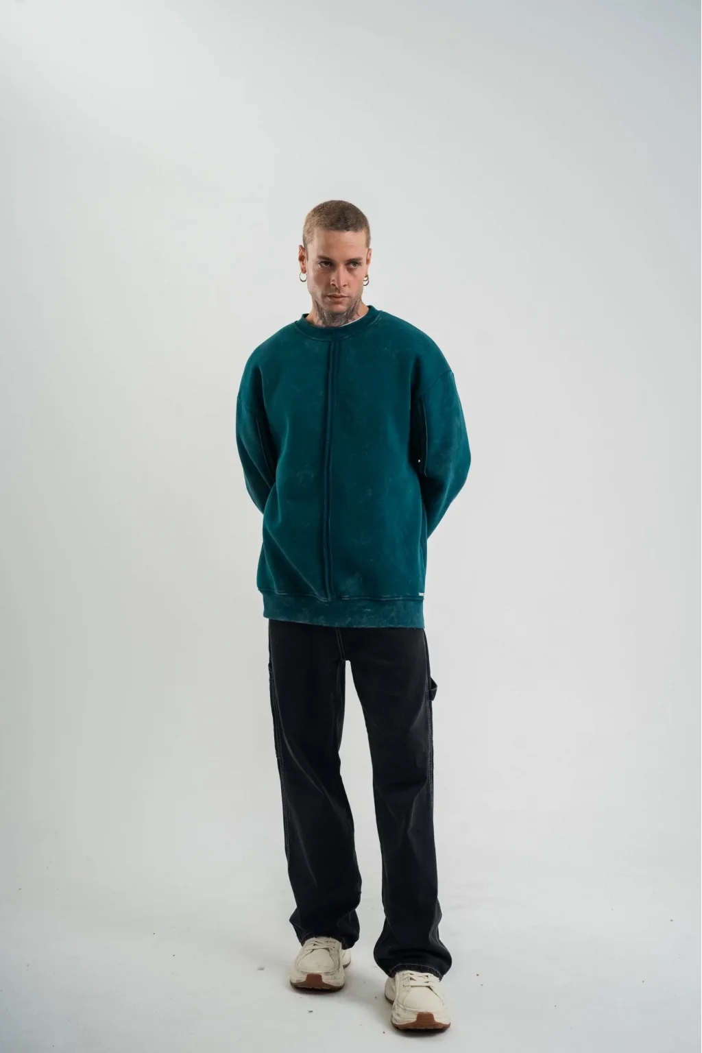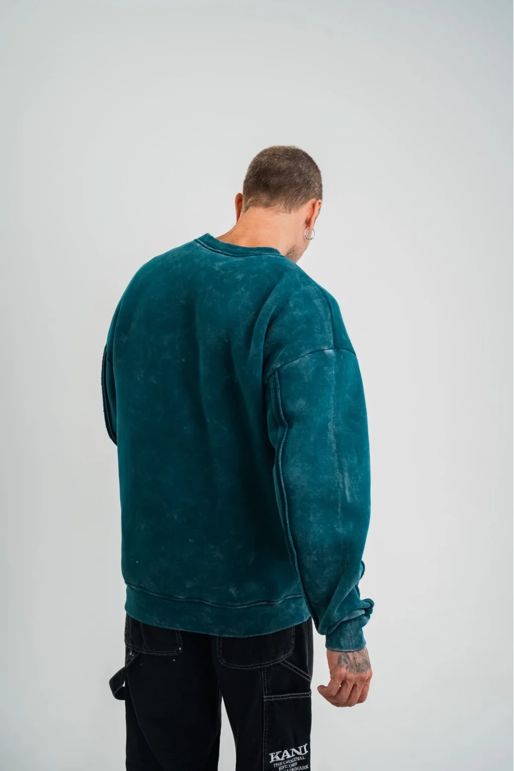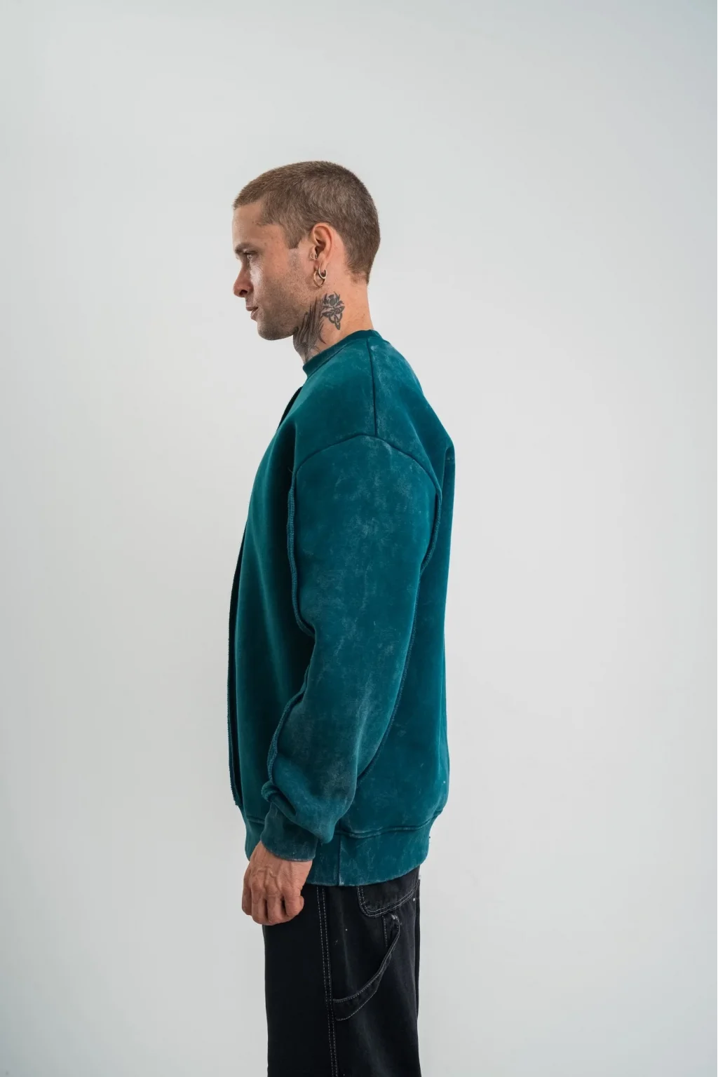 Unisex Bisiklet Yaka Özel Pis Dikişli Yıkamalı SweatShirt - Koyu Deniz Yeşili