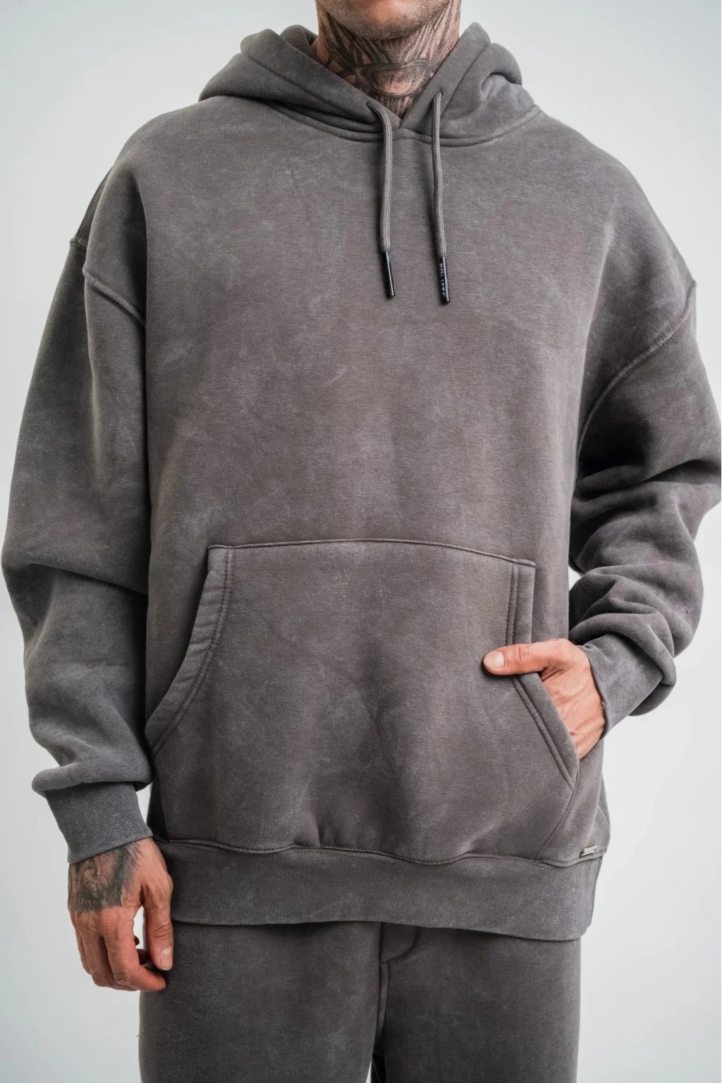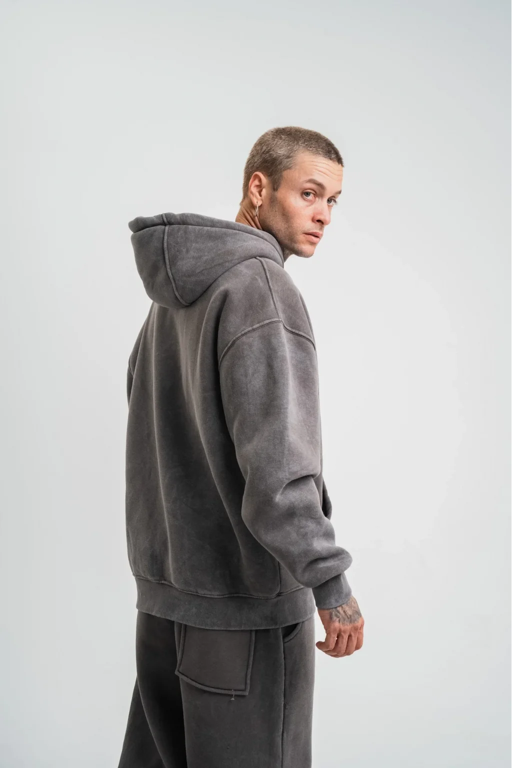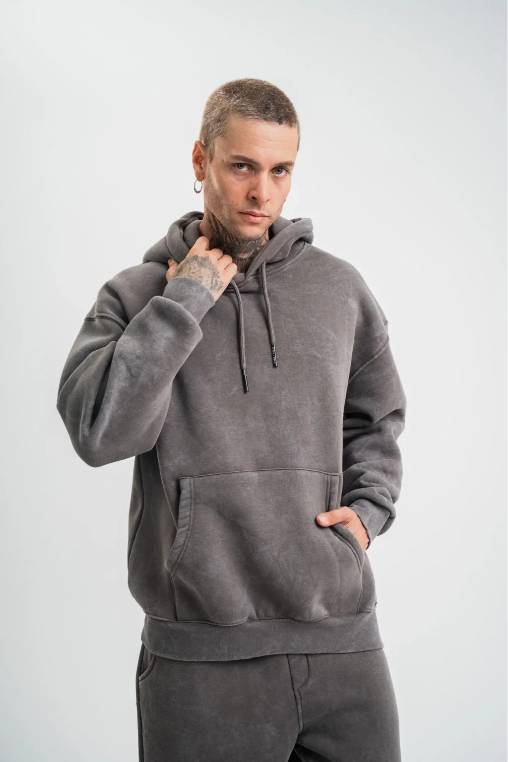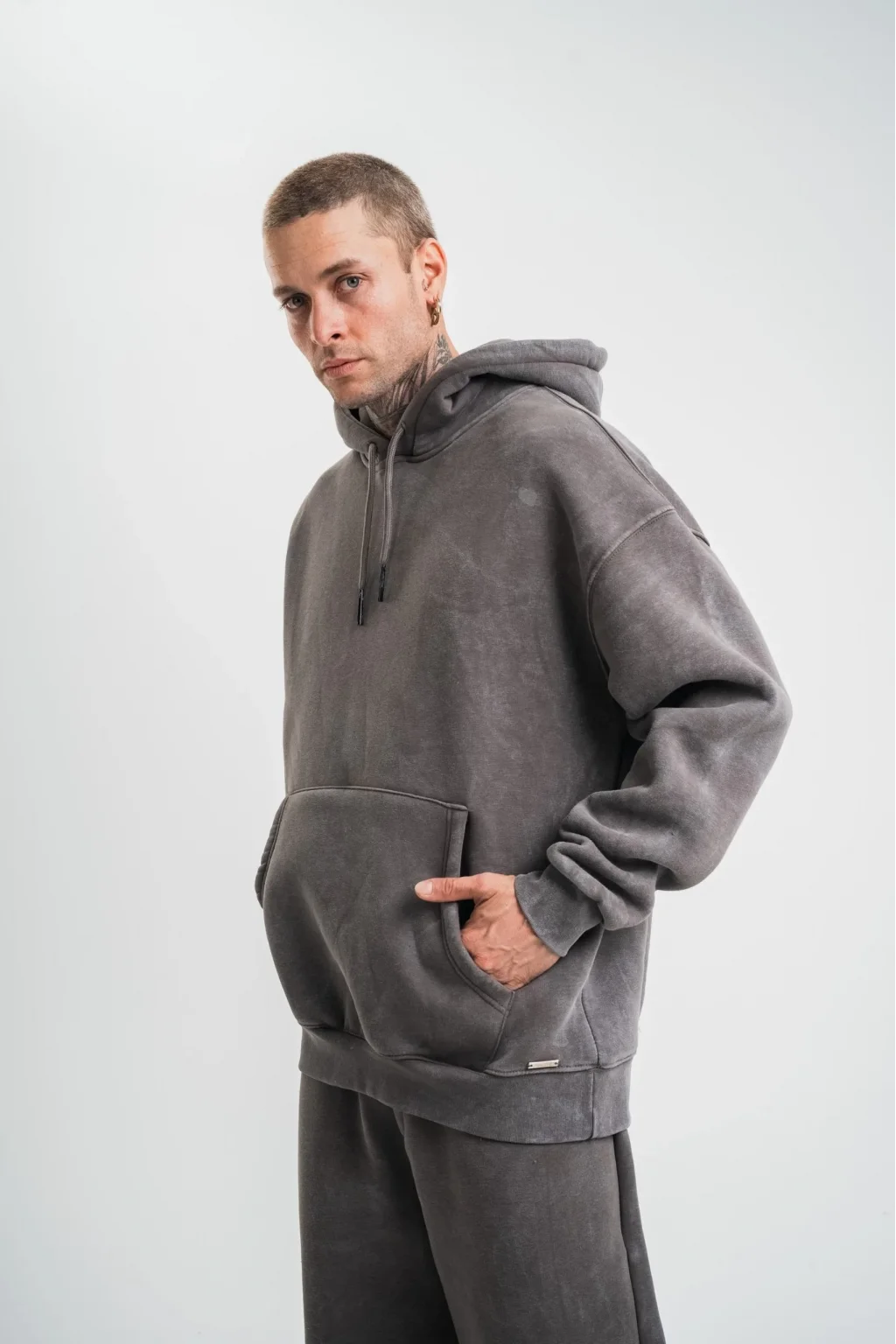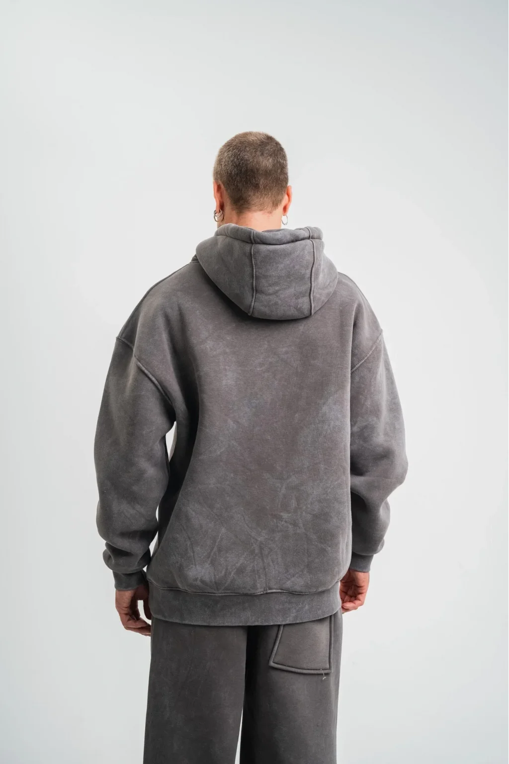 Unisex Double Oversize Kapşonlu Yıkamalı SweatShirt - Füme