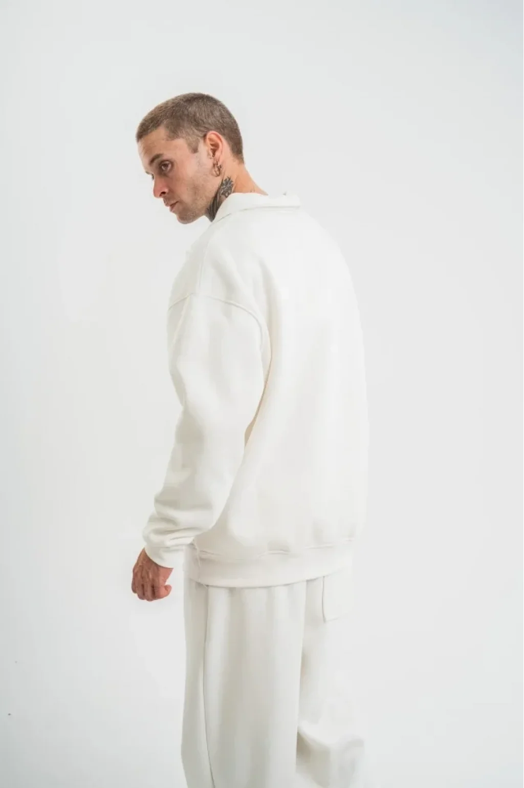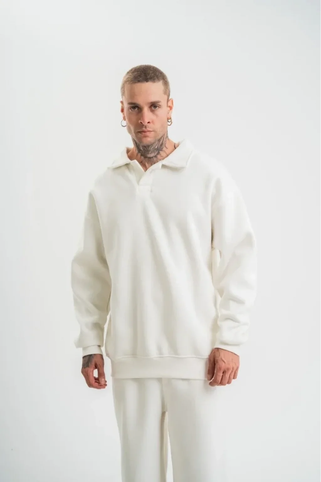Unisex Double Oversize Patlı Yaka SweatShirt - Beyaz