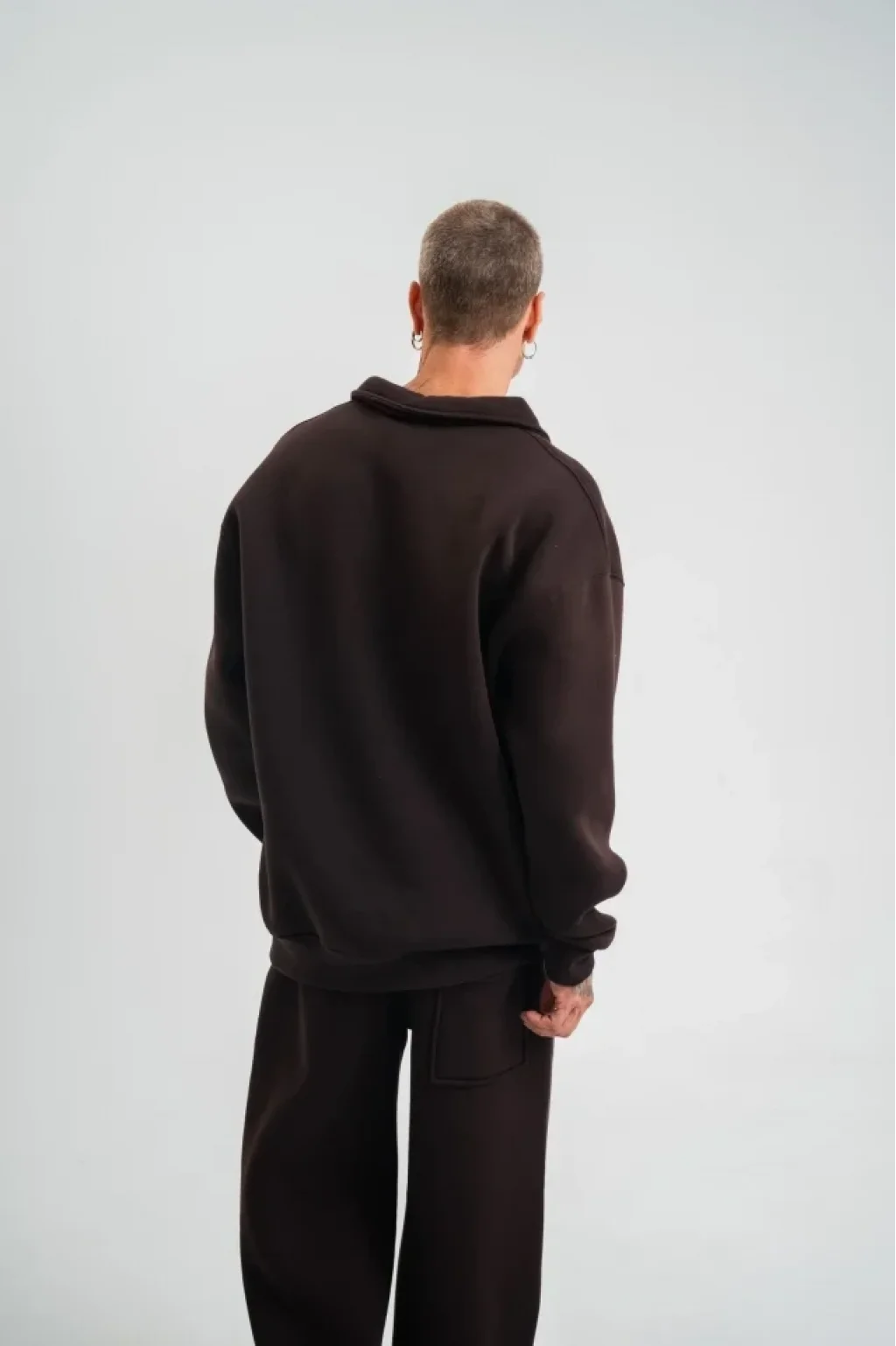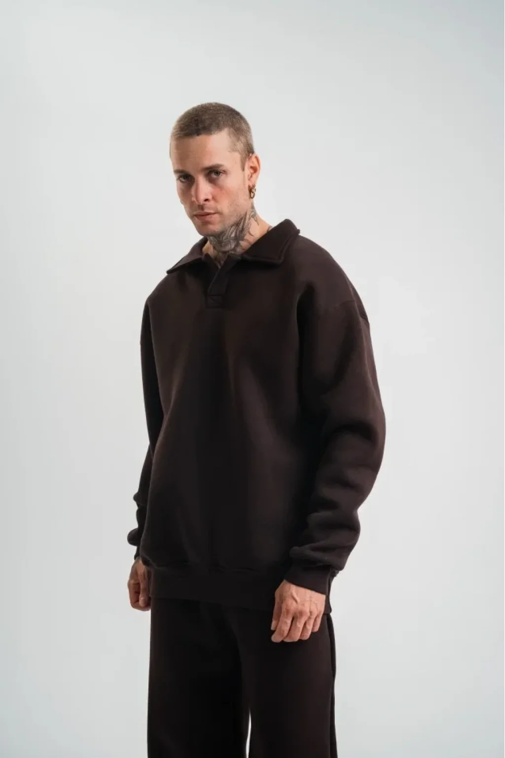 Unisex Double Oversize Patlı Yaka SweatShirt - Kahve