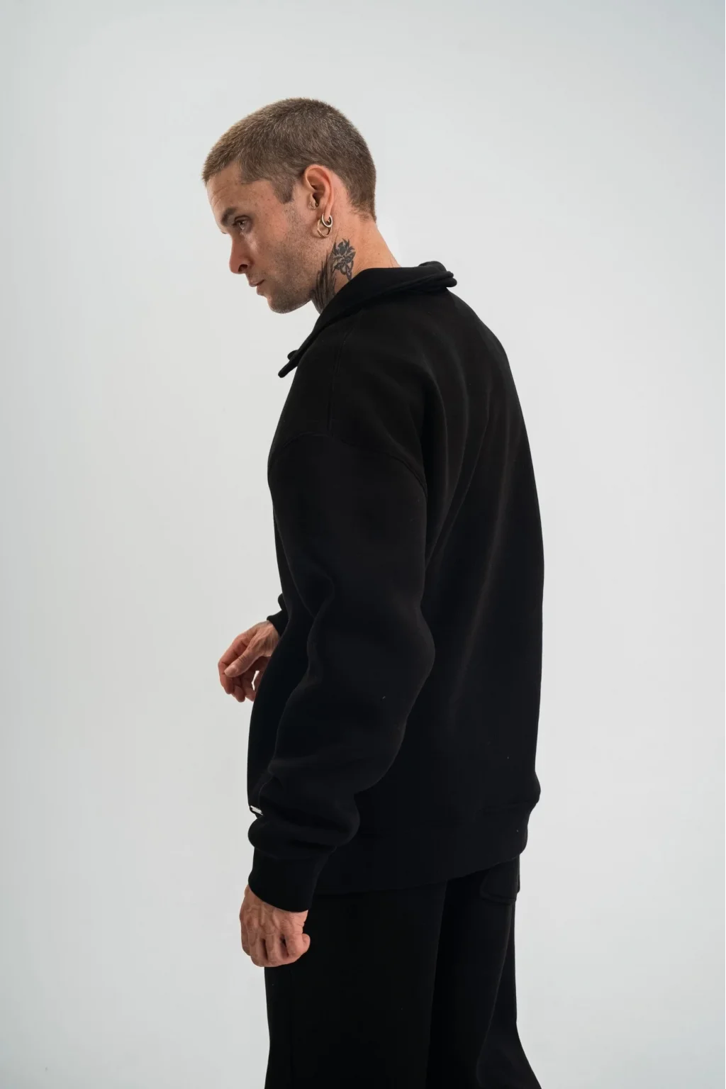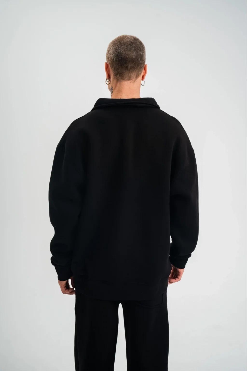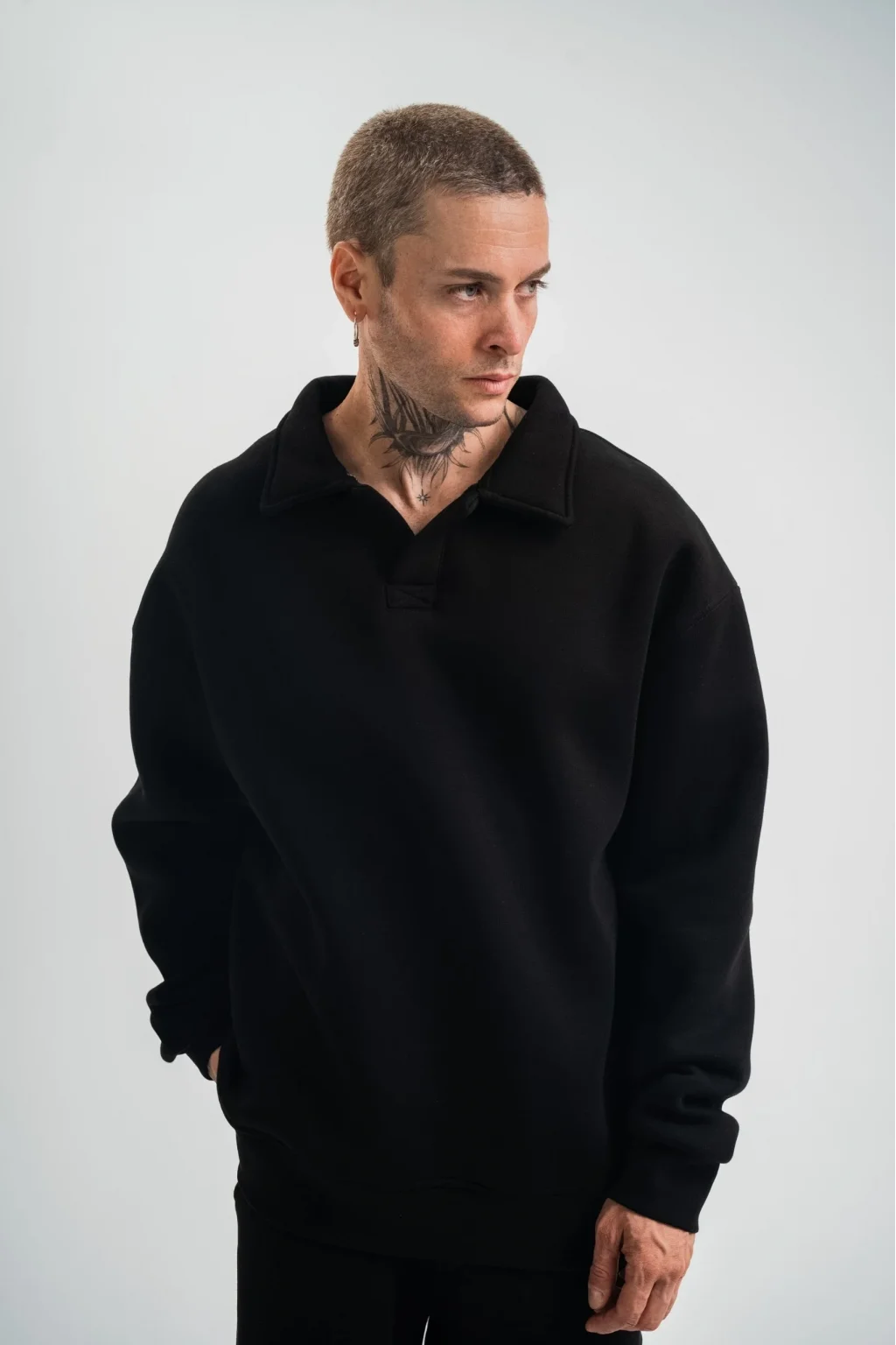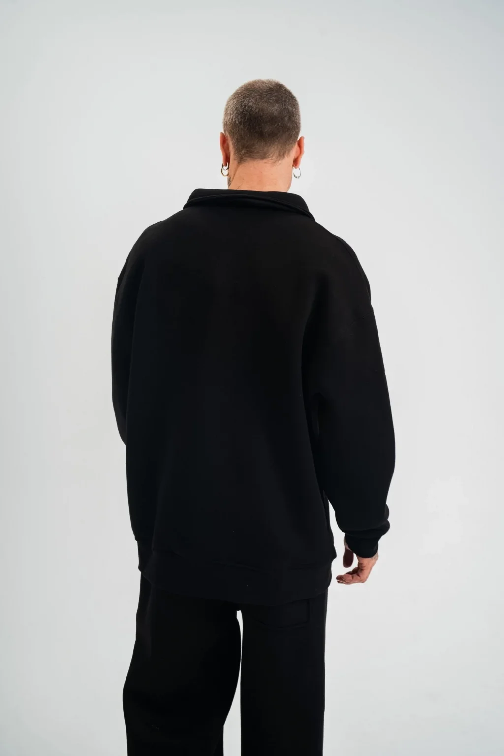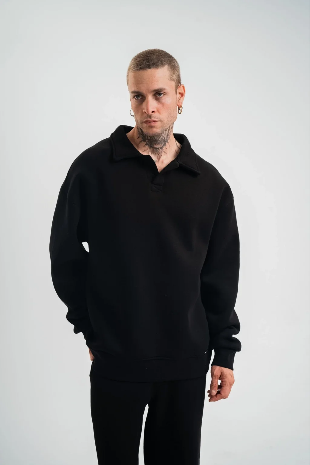 Unisex Double Oversize Patlı Yaka SweatShirt - Siyah
