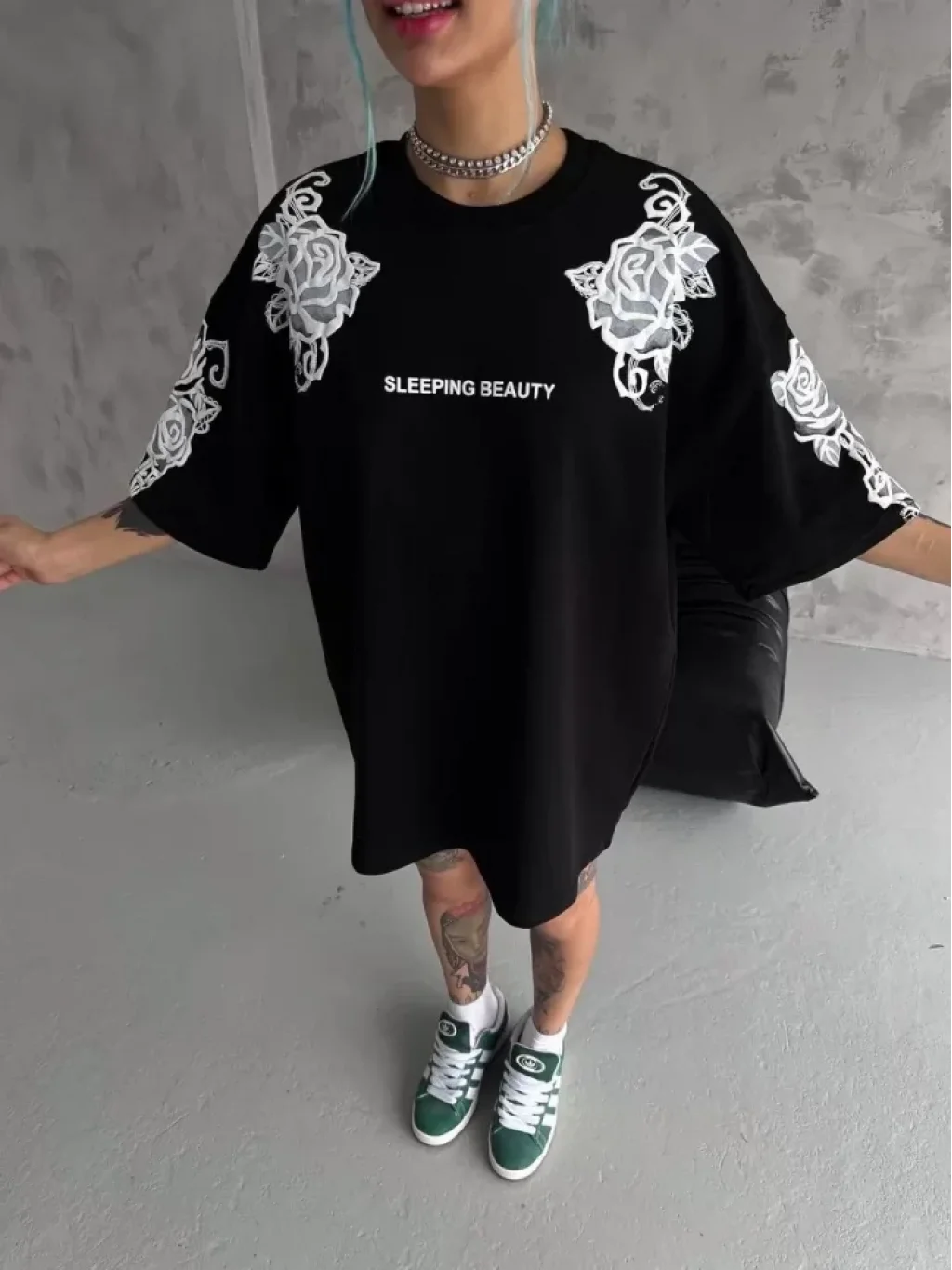 Unisex Flok Kabartma Baskılı T-Shirt - Siyah