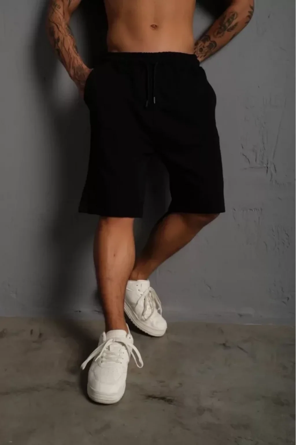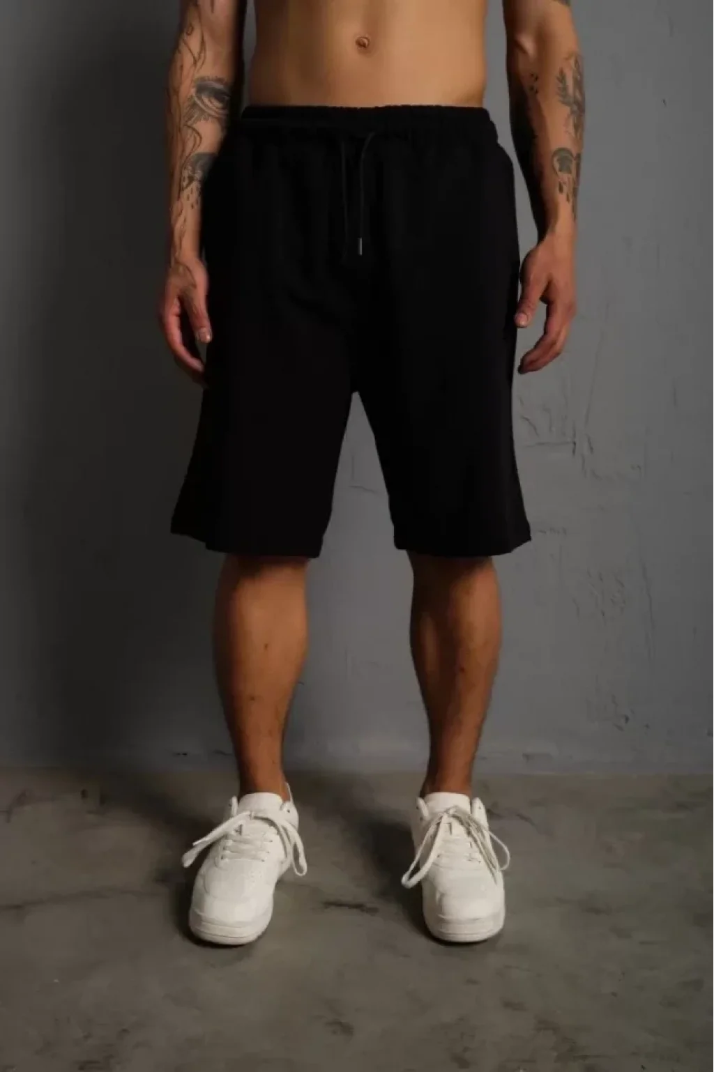 Unisex İki İplik Düz Oversize Şort - Siyah