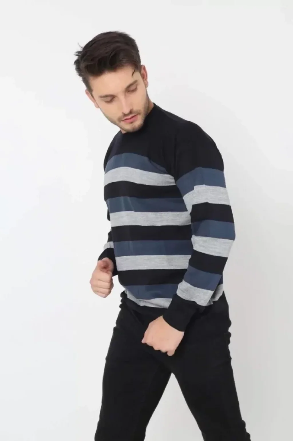 Unisex Kalın Çizgili Bisiklet Yaka Triko Kazak - Indigo