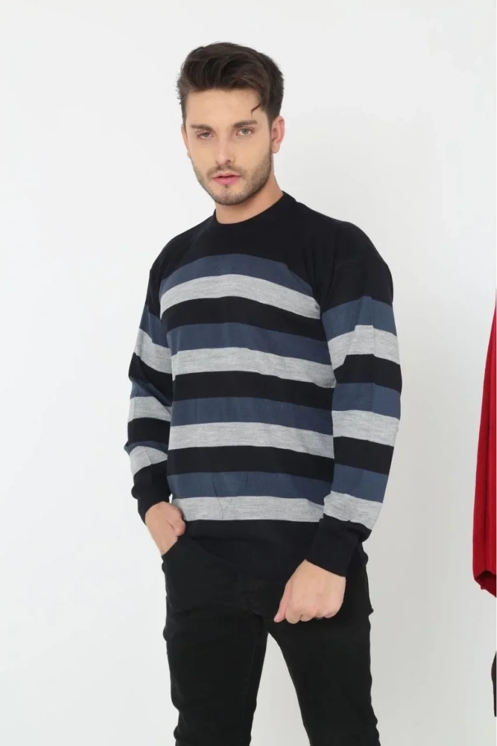 Unisex Kalın Çizgili Bisiklet Yaka Triko Kazak - Indigo