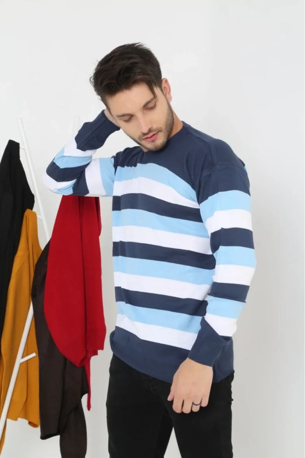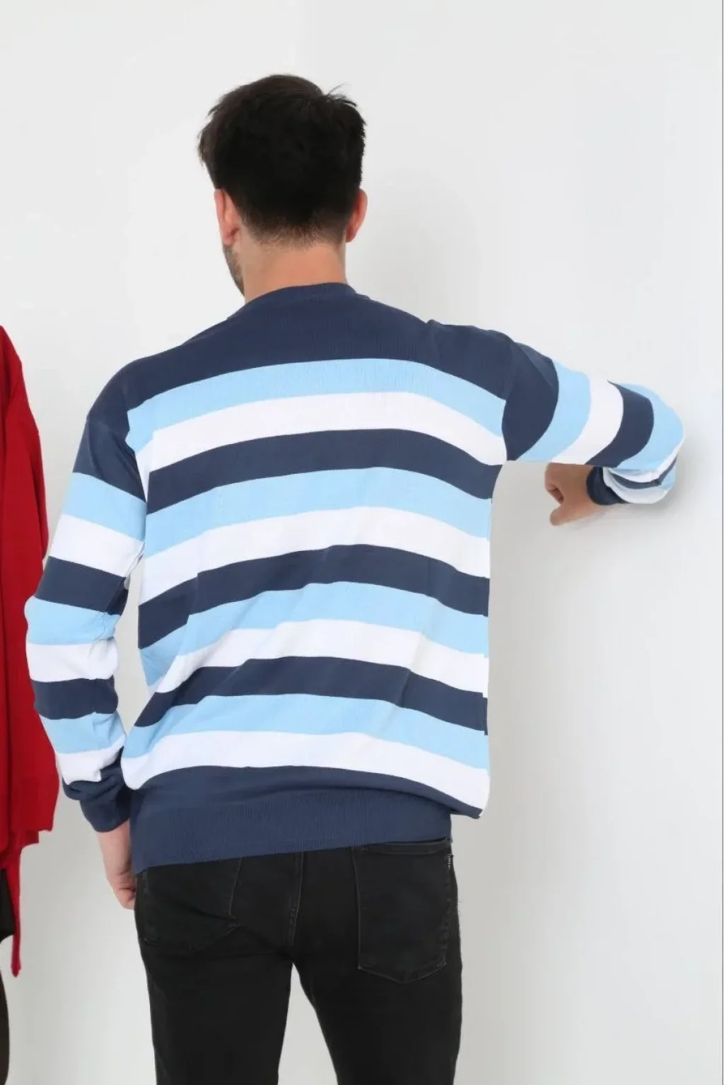 Unisex Kalın Çizgili Bisiklet Yaka Triko Kazak - Mavi