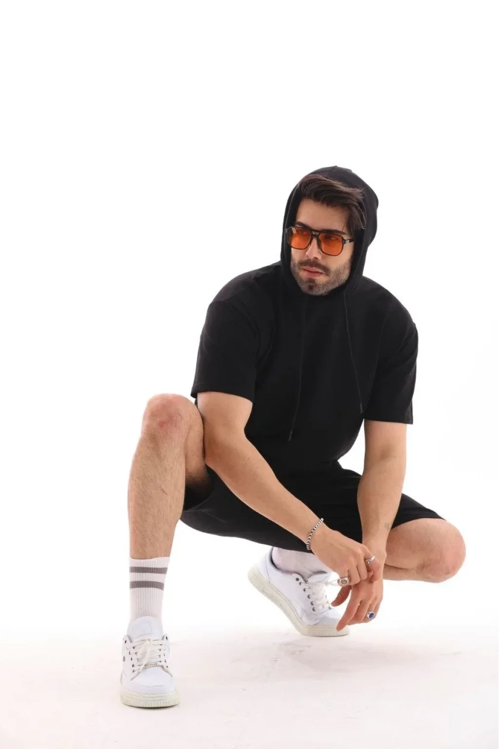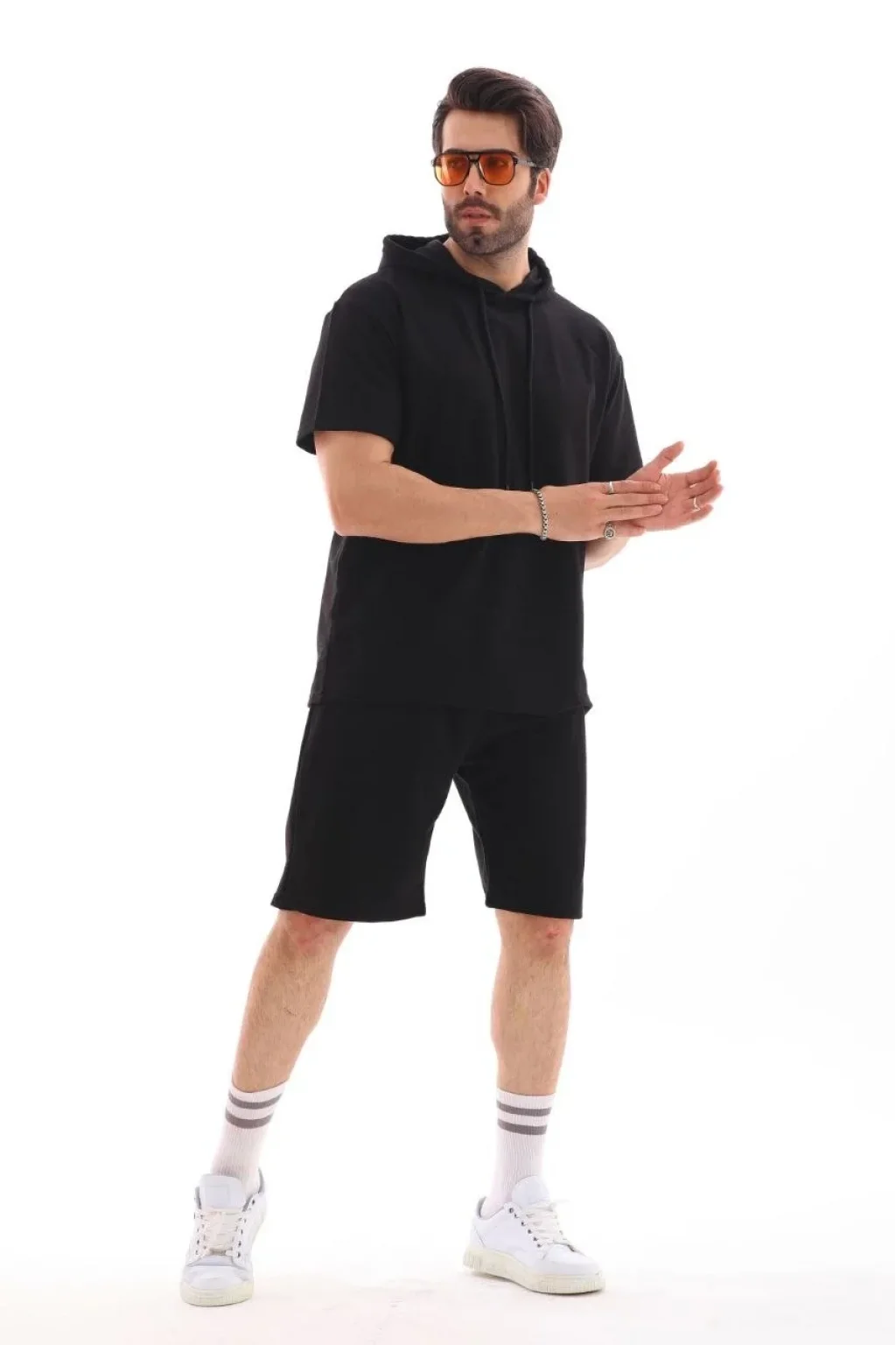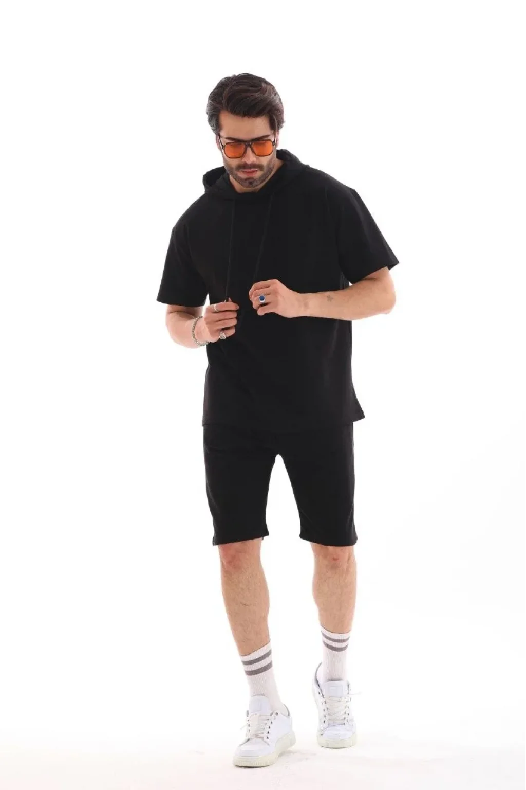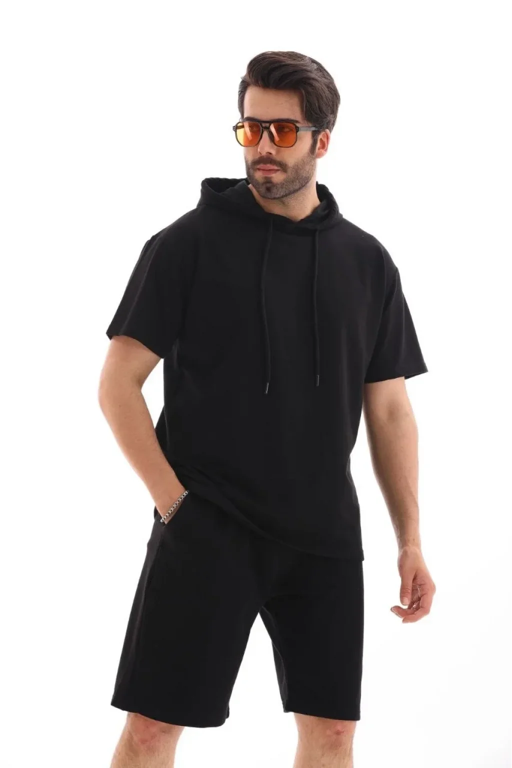 Unisex Kapşonlu Oversize T-Shirt Şortlu Takım - Siyah