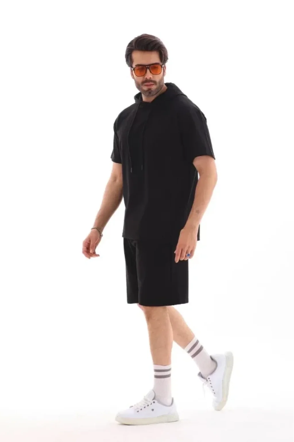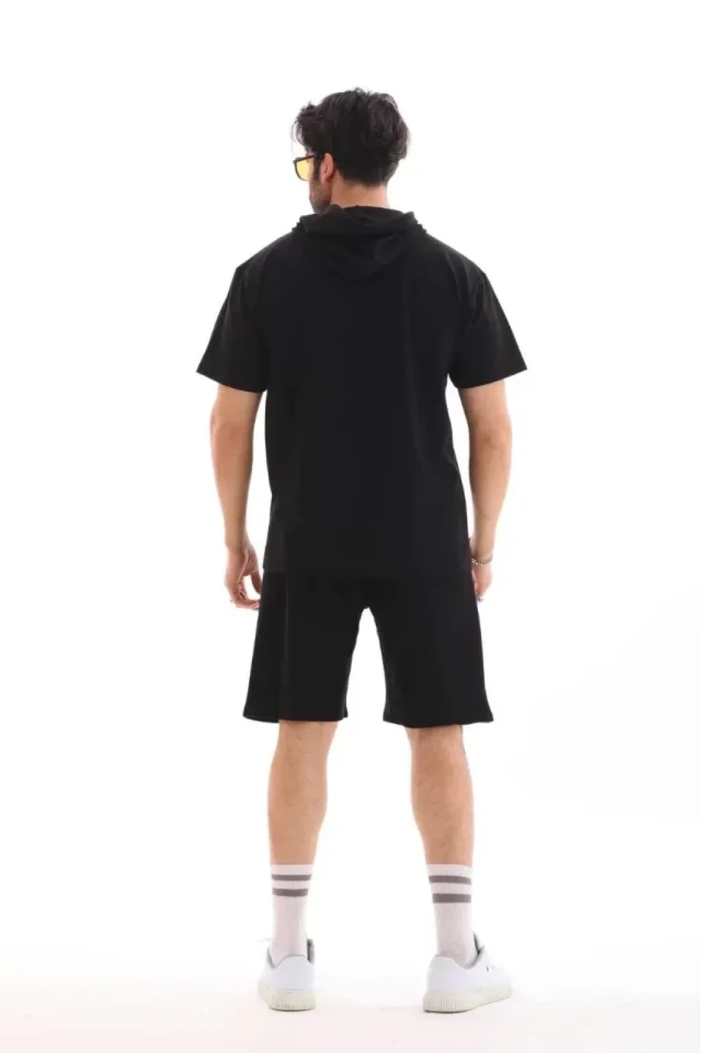Unisex Kapşonlu Oversize T-Shirt Şortlu Takım - Siyah