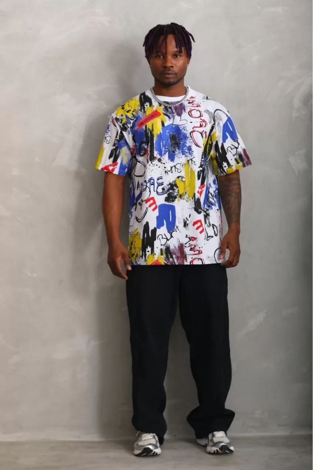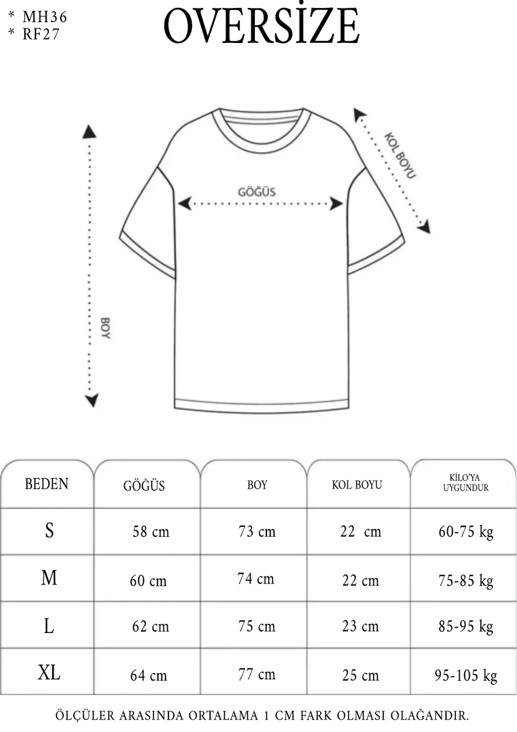 Unisex Oversize Baskılı Bisiklet Yaka T-Shirt - Beyaz