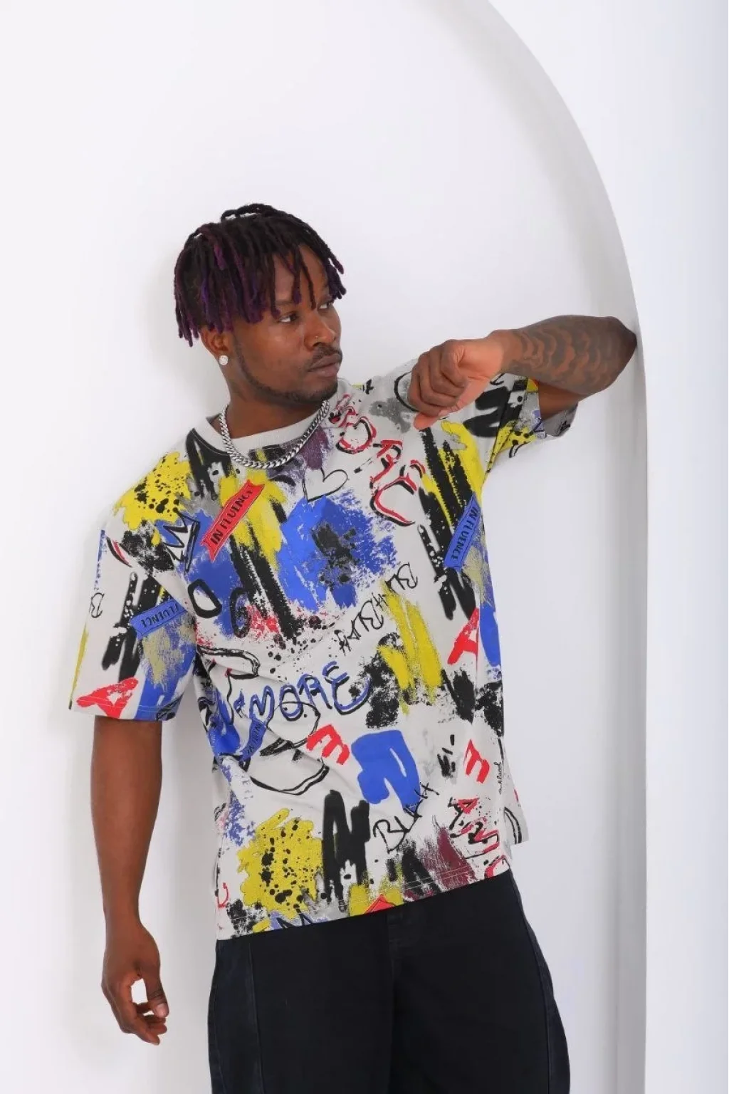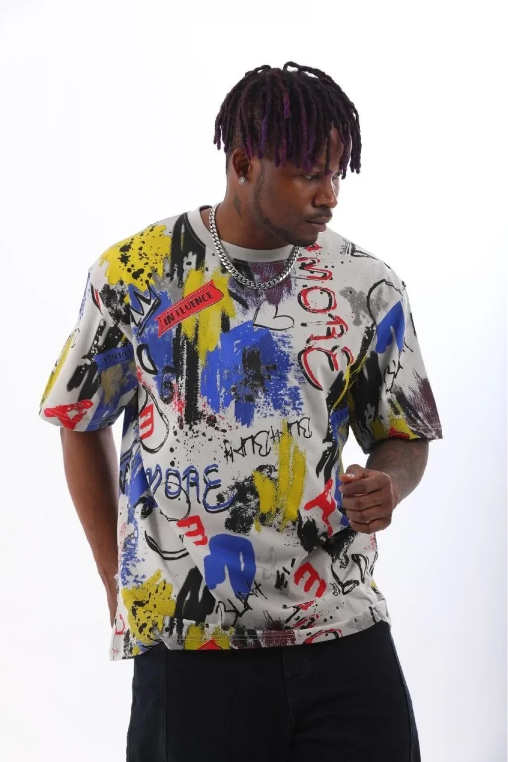 Unisex Oversize Baskılı Bisiklet Yaka T-Shirt - Gri