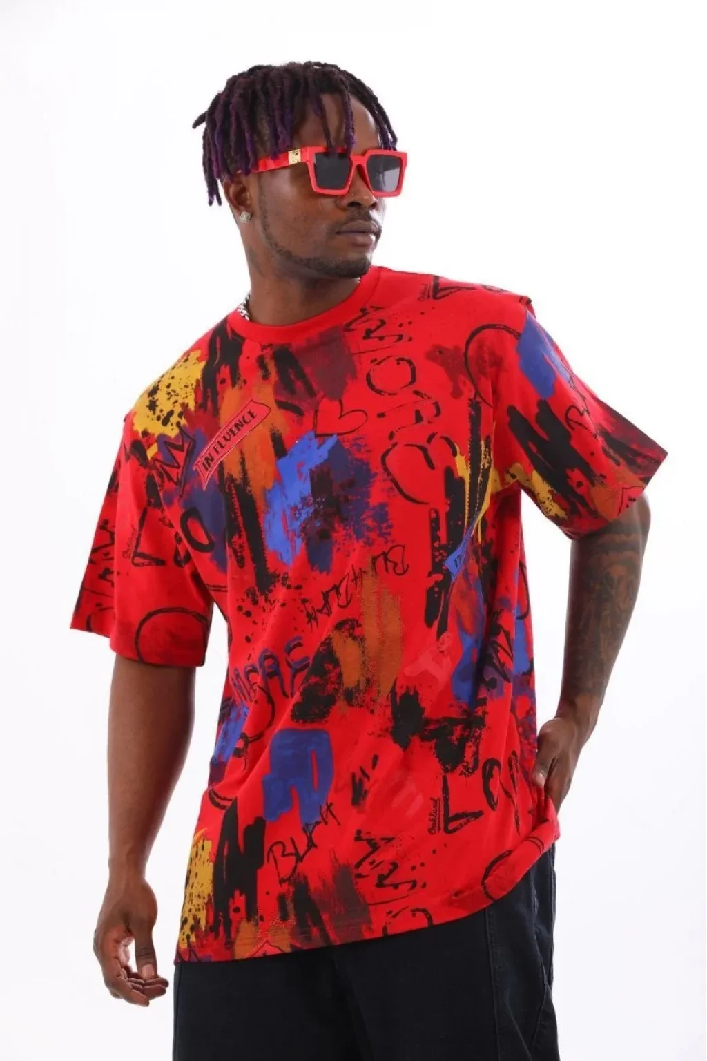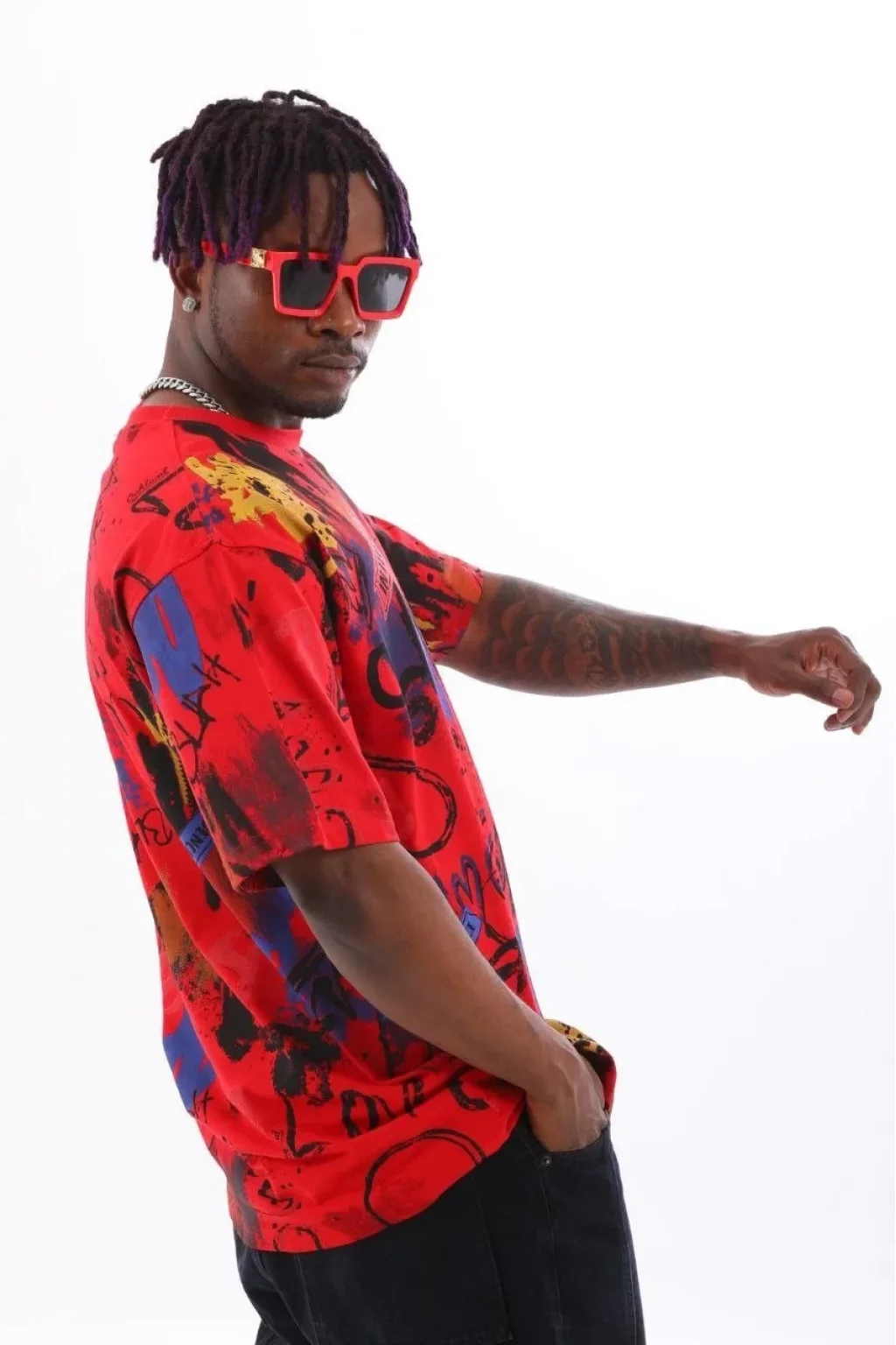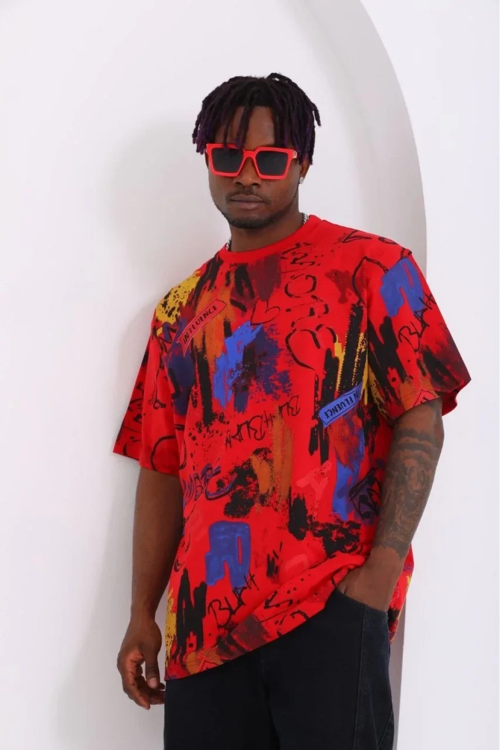 Unisex Oversize Baskılı Bisiklet Yaka T-Shirt - Kırmızı
