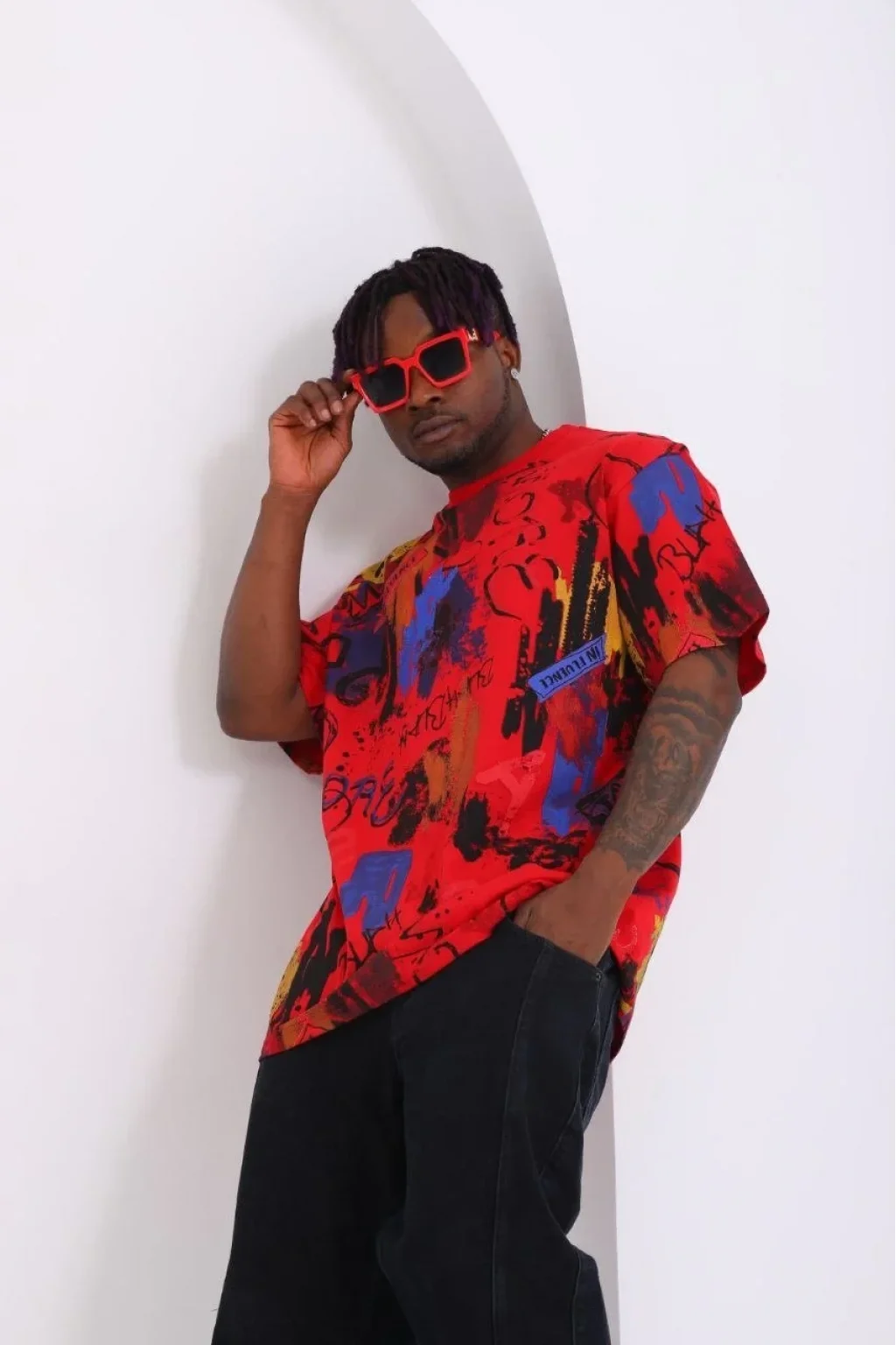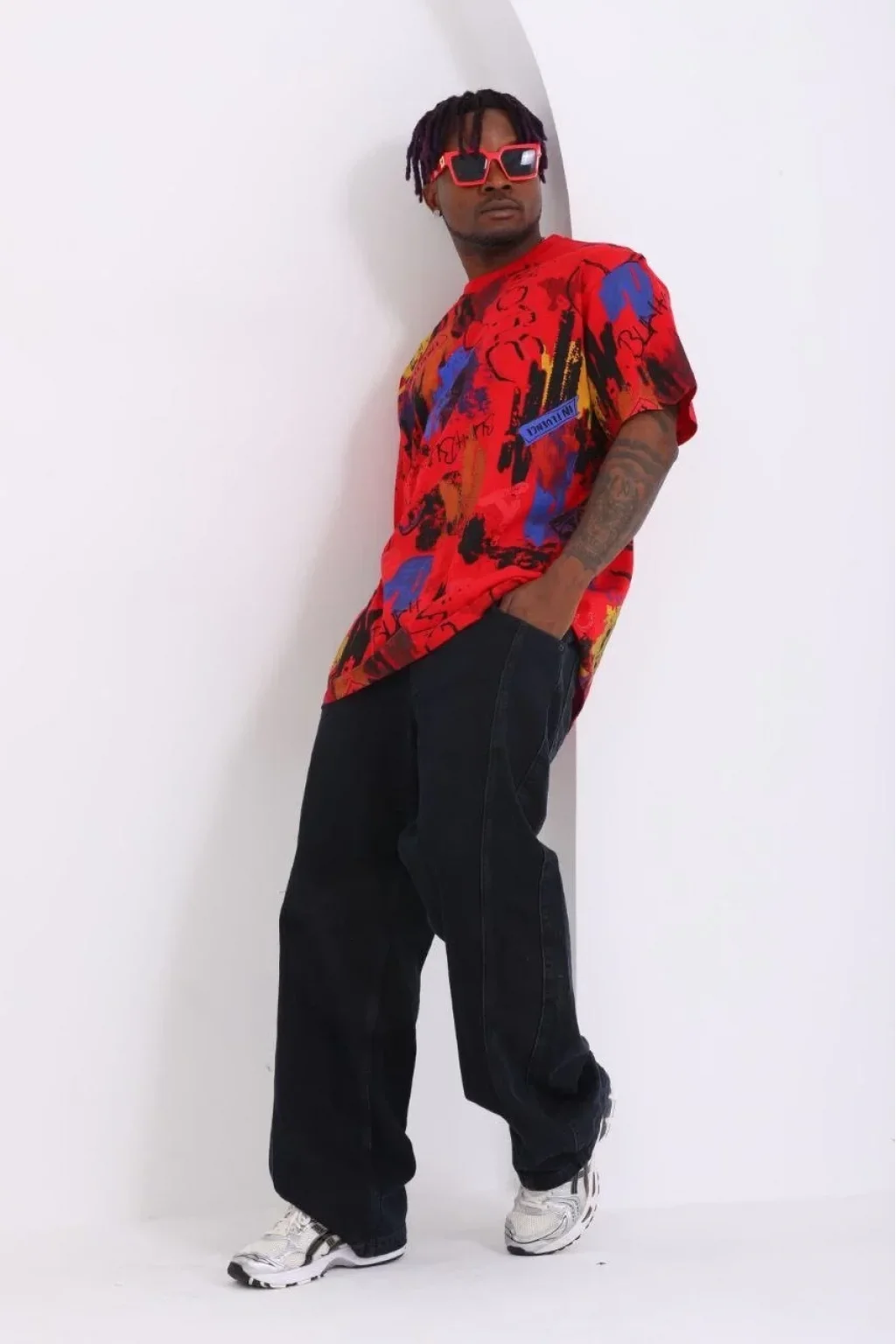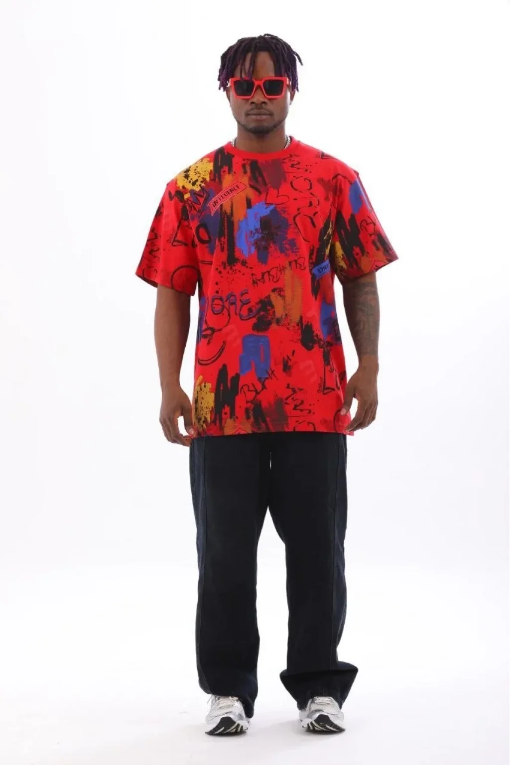 Unisex Oversize Baskılı Bisiklet Yaka T-Shirt - Kırmızı