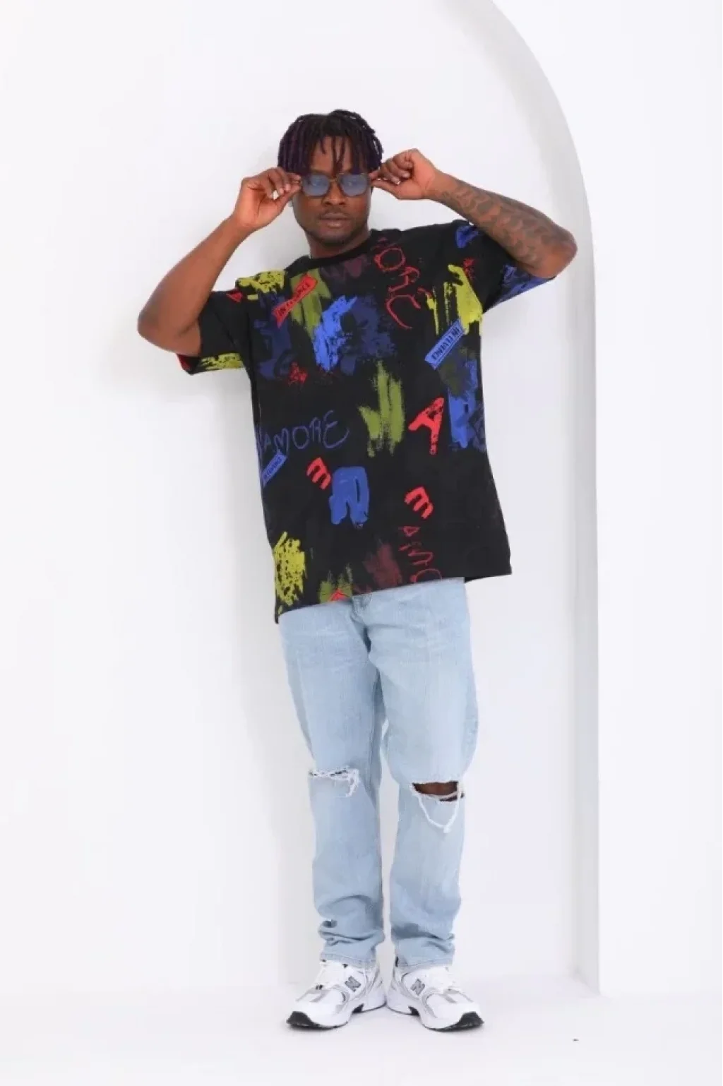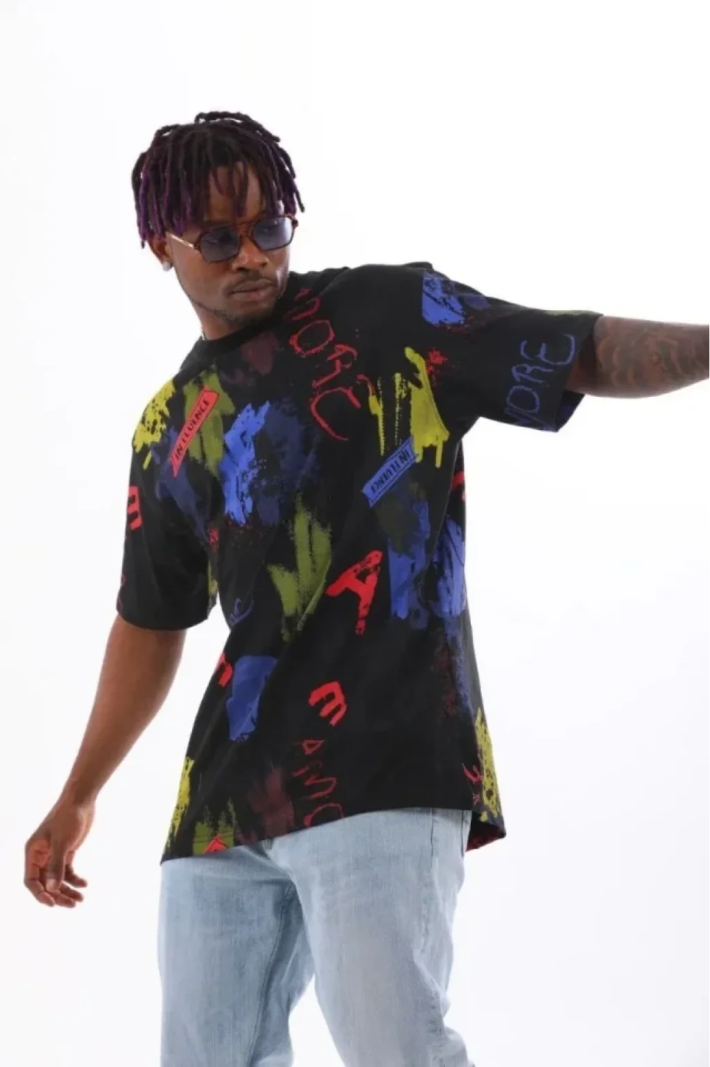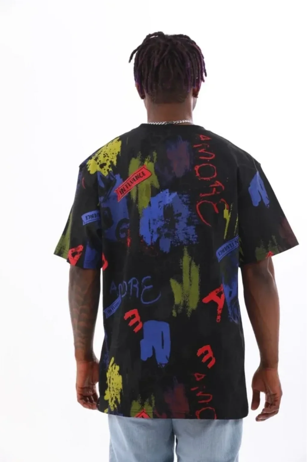 Unisex Oversize Baskılı Bisiklet Yaka T-Shirt - Siyah