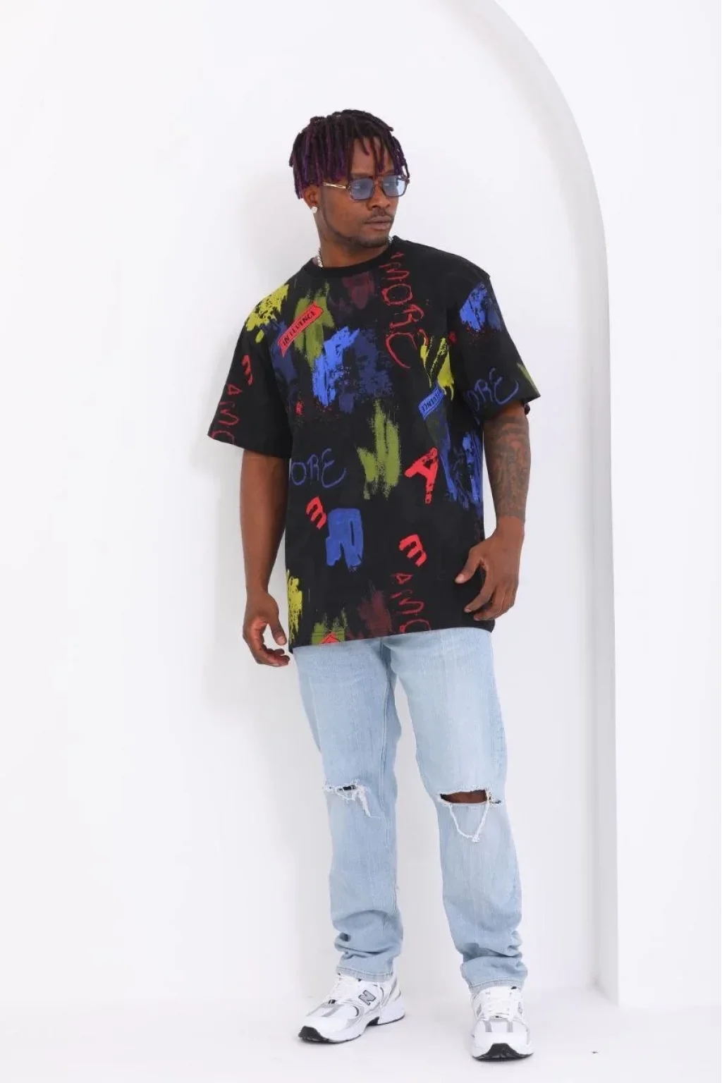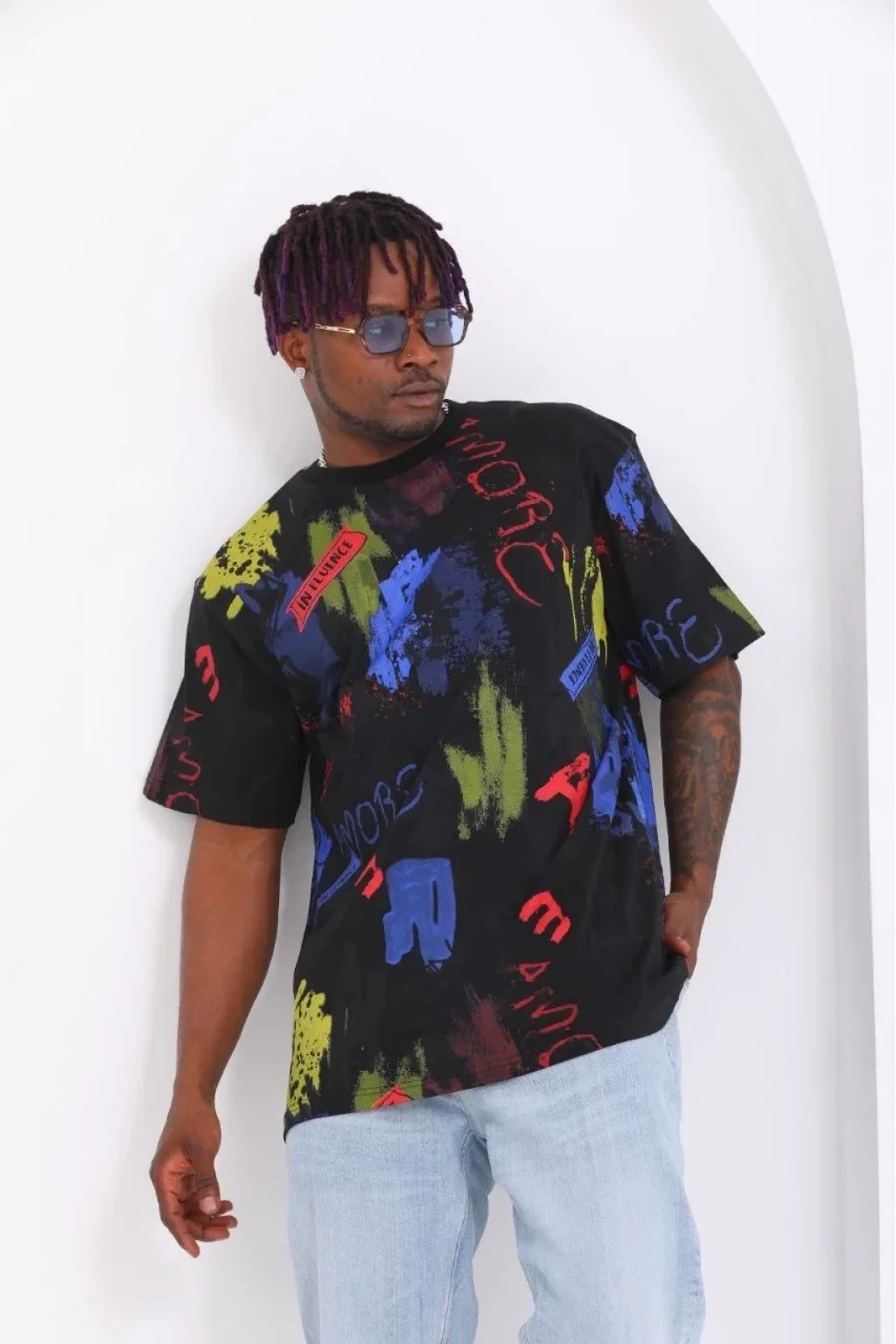 Unisex Oversize Baskılı Bisiklet Yaka T-Shirt - Siyah