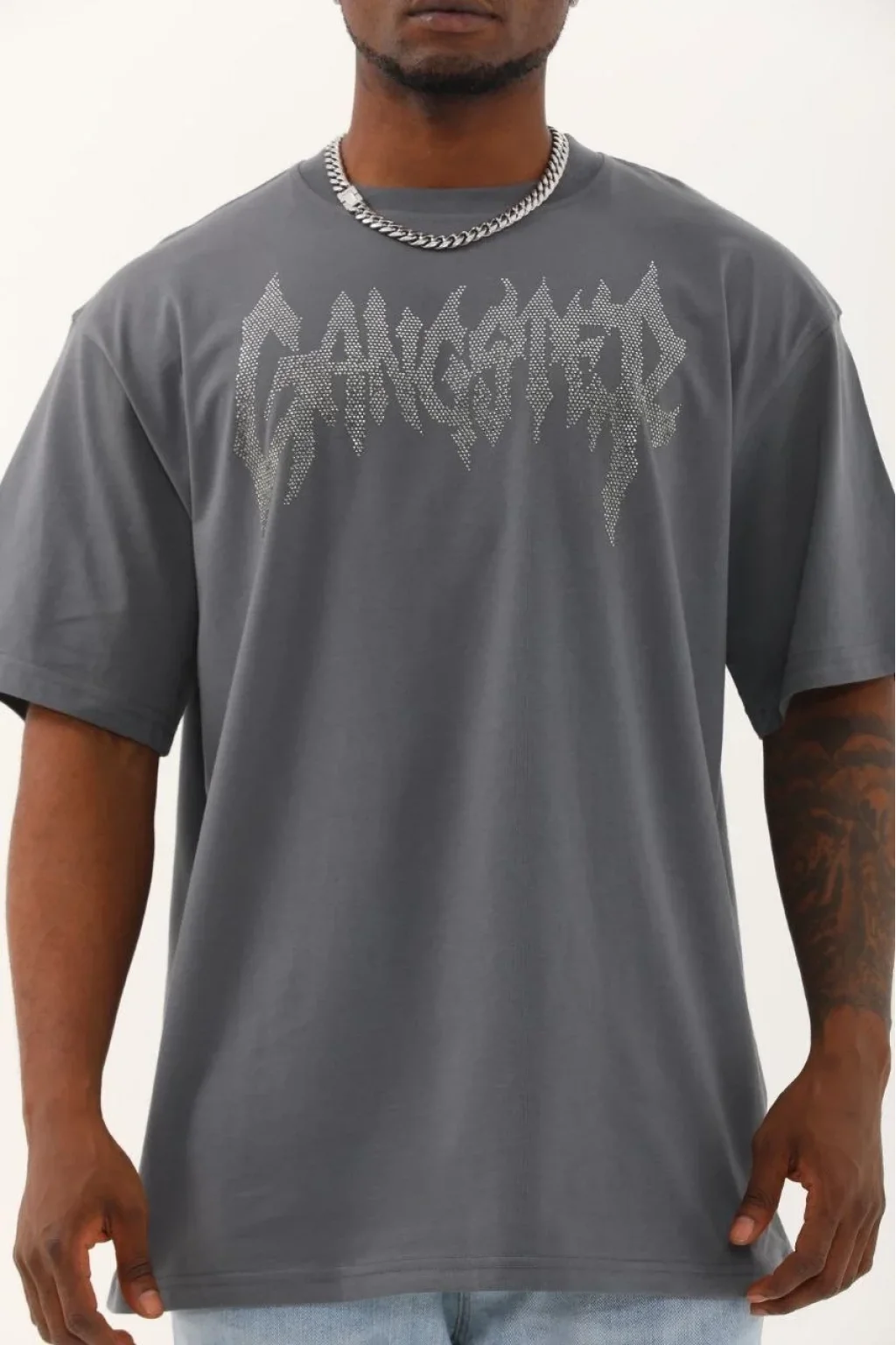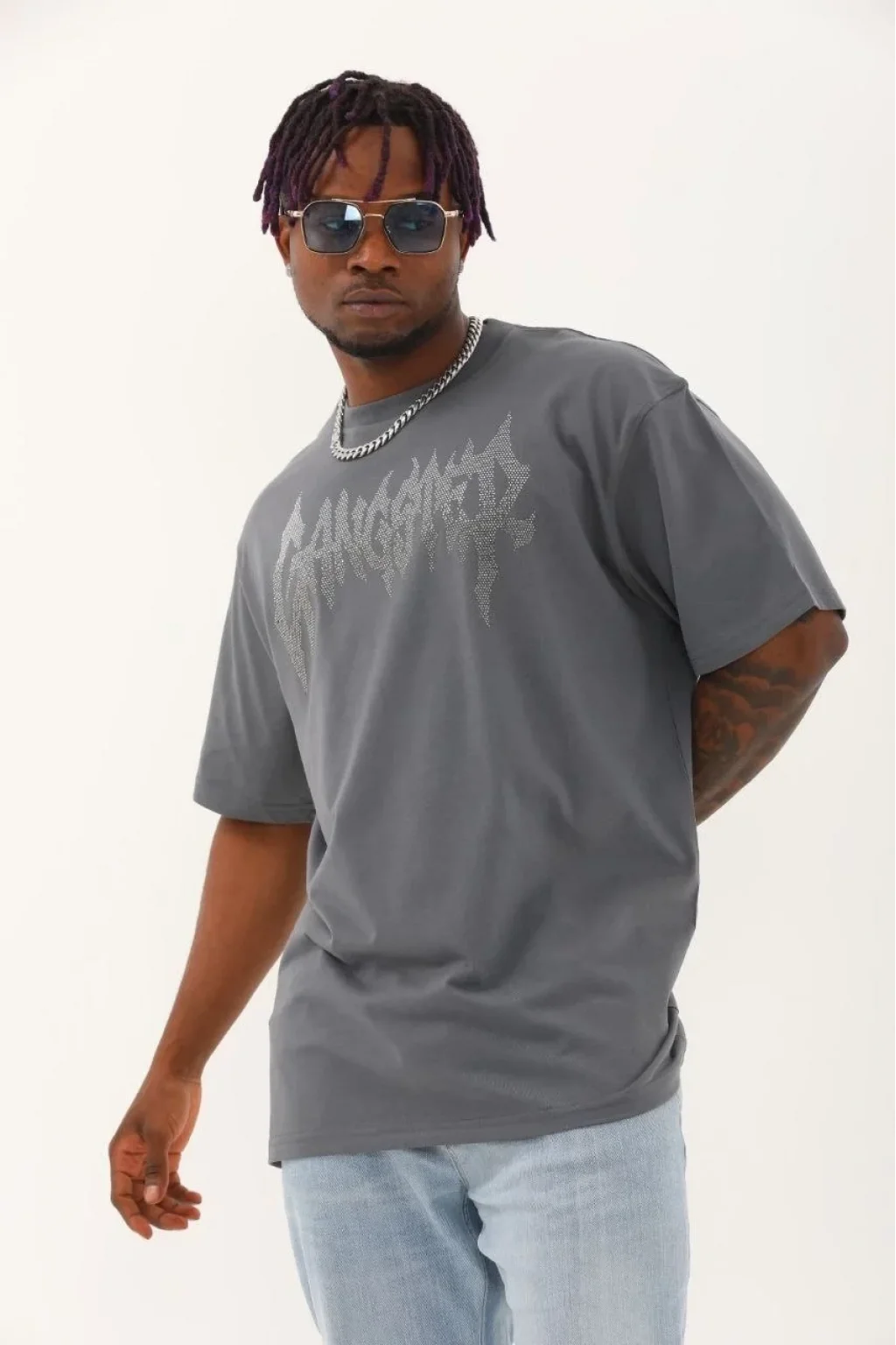 • Unisex Oversize Taşlı Bisiklet Yaka T-Shirt - Füme