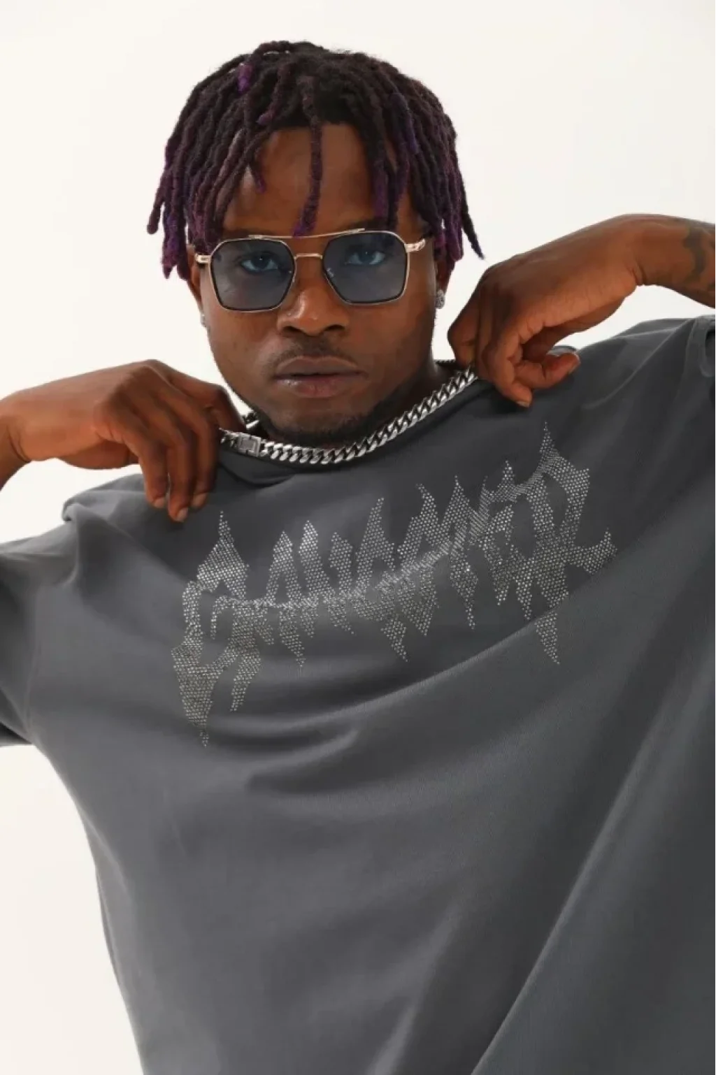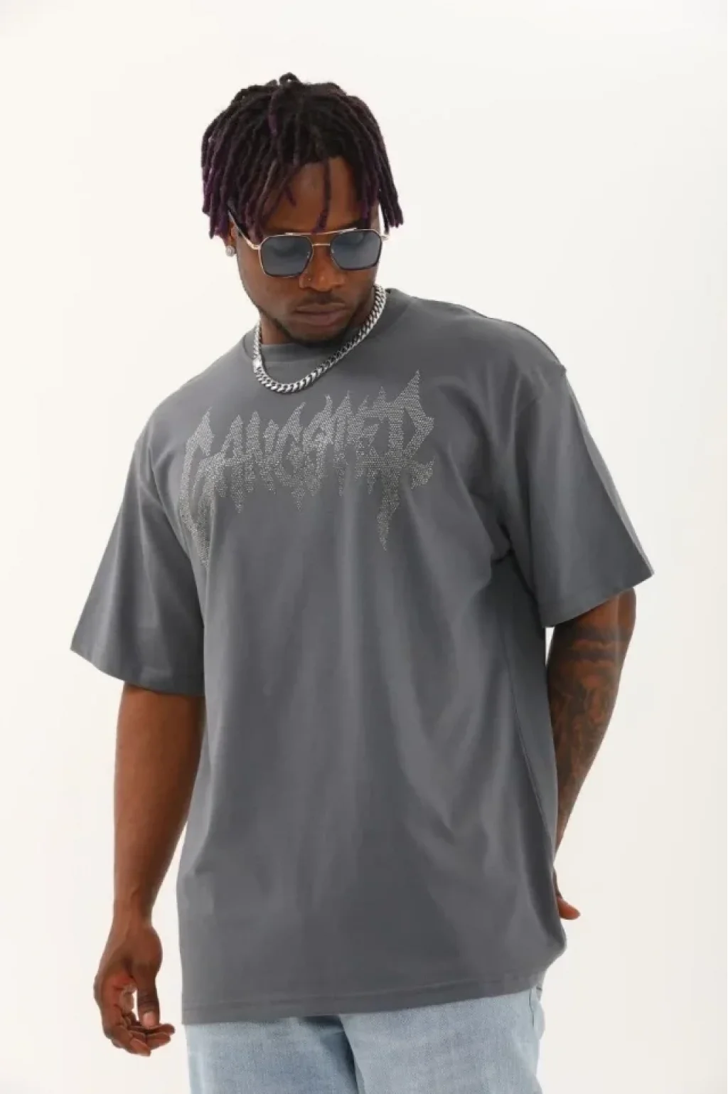 Unisex Oversize Taşlı Bisiklet Yaka T-Shirt - Füme