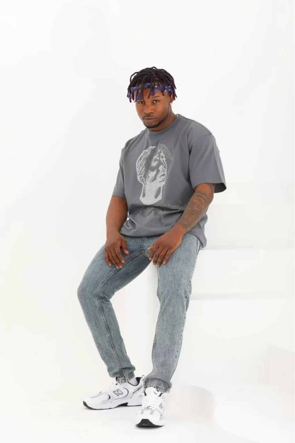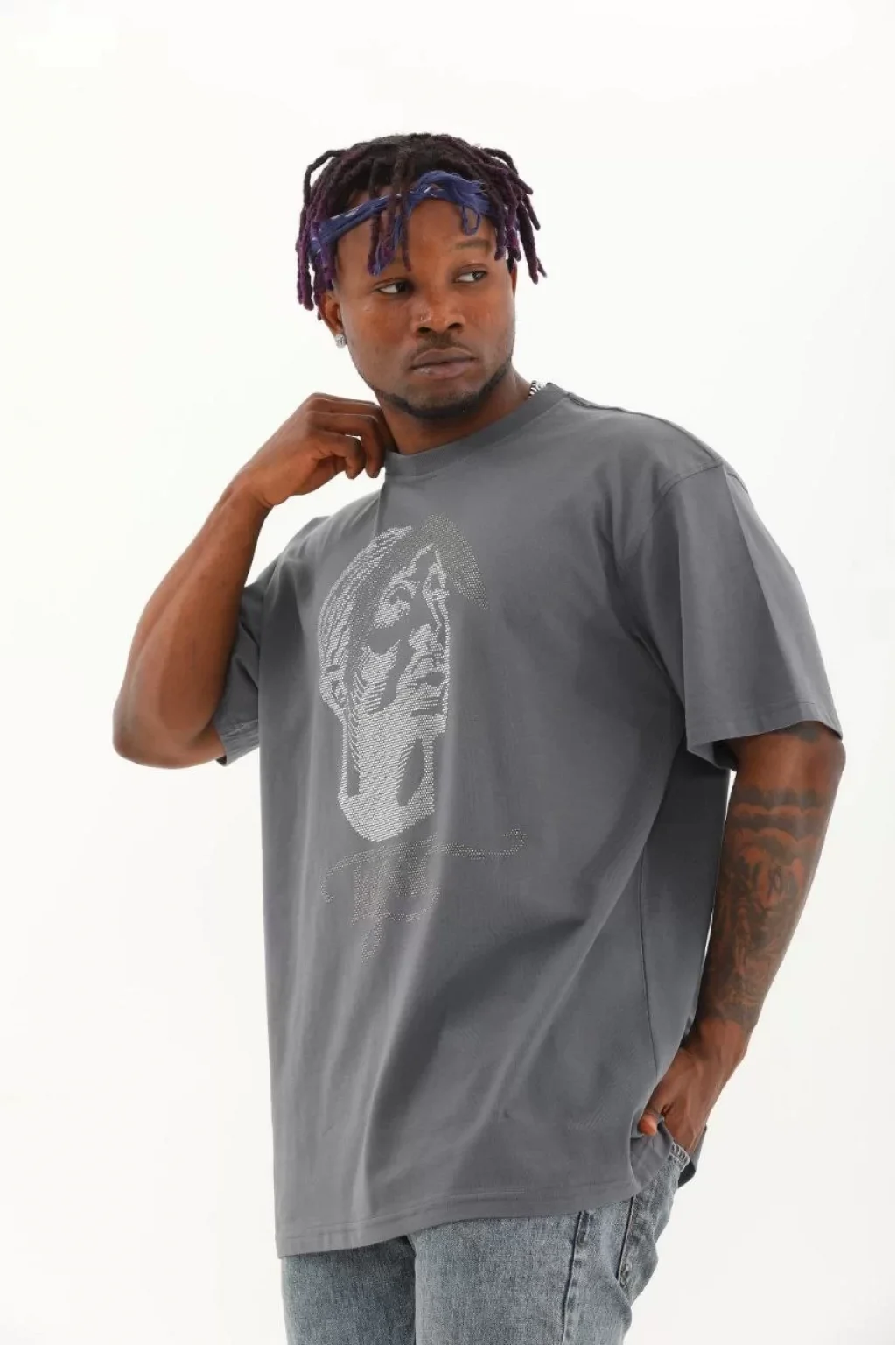 Unisex Oversize Taşlı Bisiklet Yaka T-Shirt - Füme