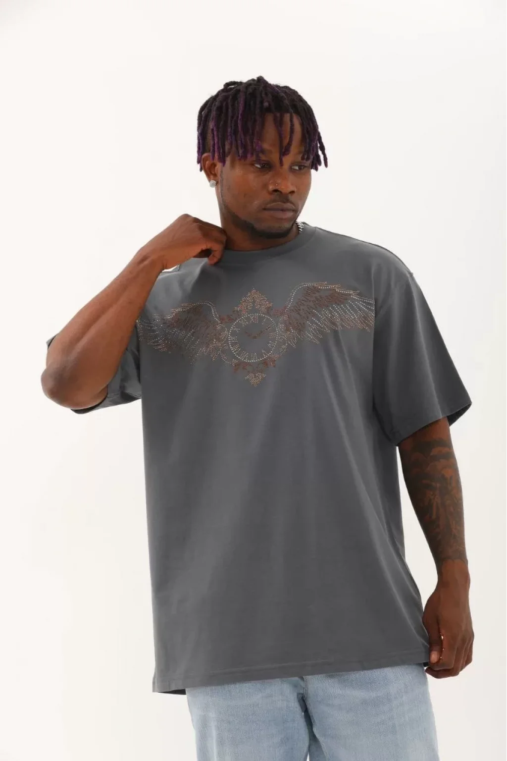 Unisex Oversize Taşlı Bisiklet Yaka T-Shirt - Füme