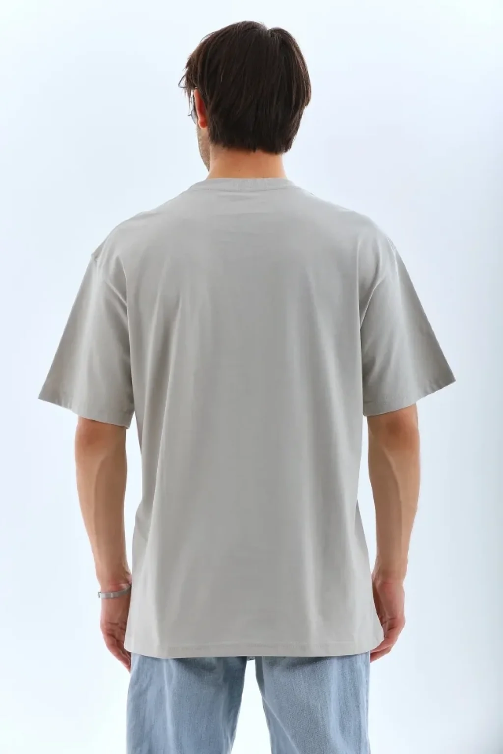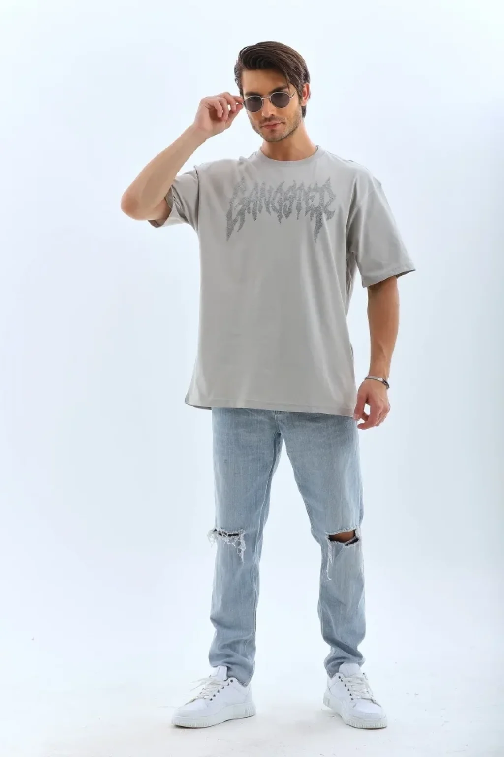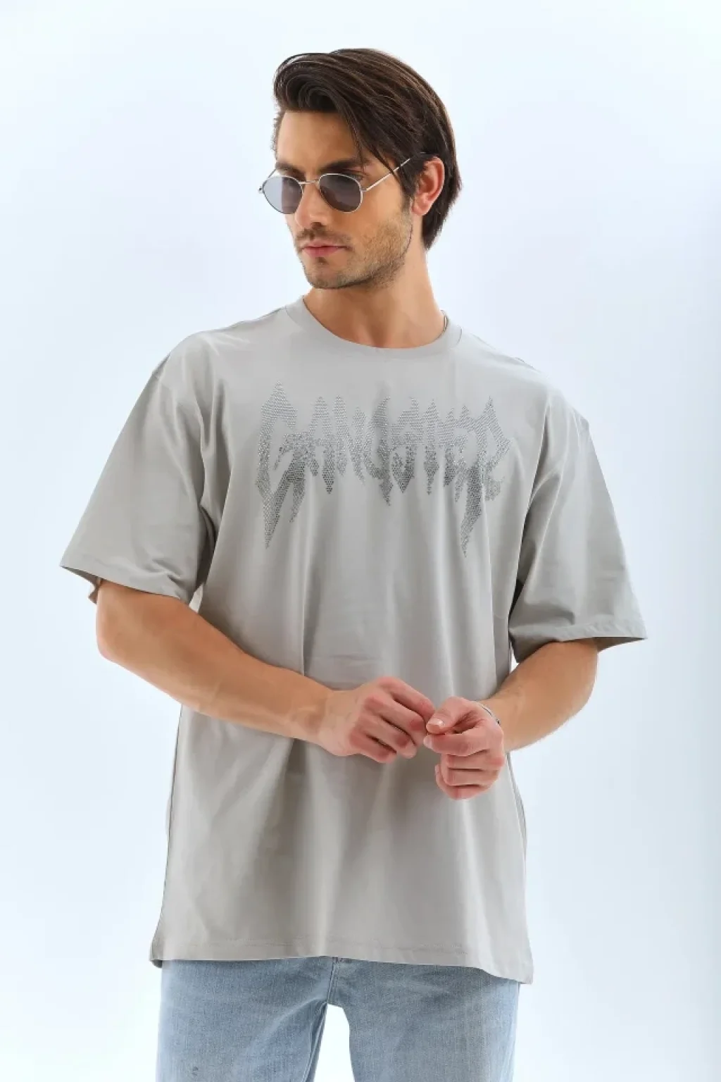 Unisex Oversize Taşlı Bisiklet Yaka T-Shirt - Gri