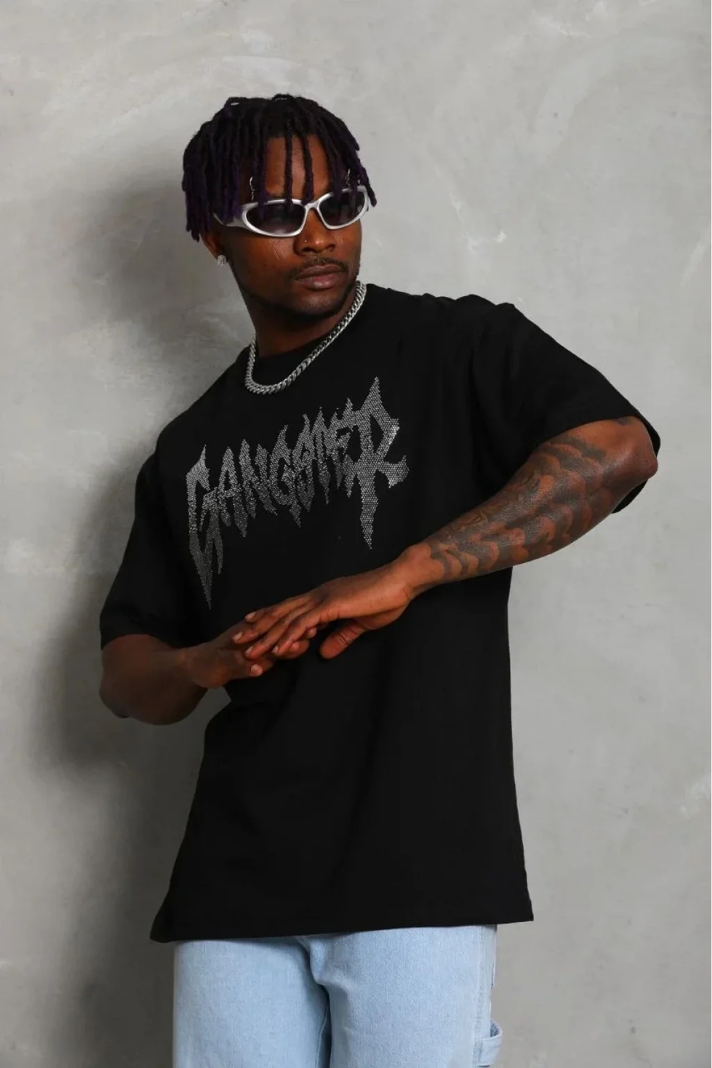 Unisex Oversize Taşlı Bisiklet Yaka T-Shirt - Siyah