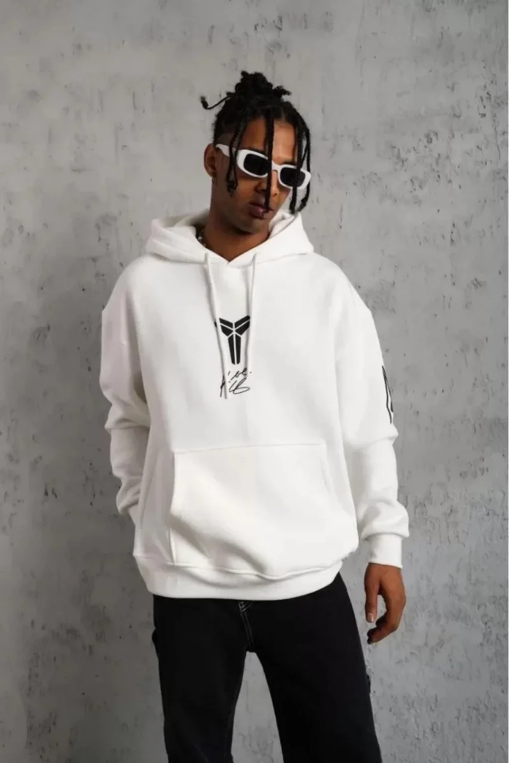 Unisex Sırt Baskılı Kapüşonlu Üç İplik Oversize Sweatshirt - Beyaz