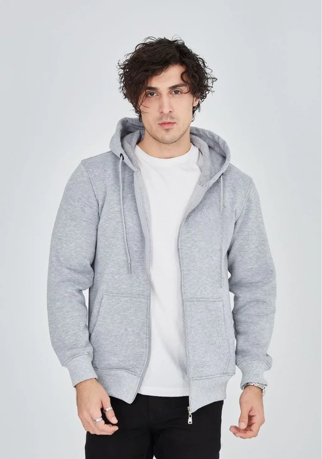 Unisex Tam Fermuarlı Kapşonlu  SweatShirt - Gri