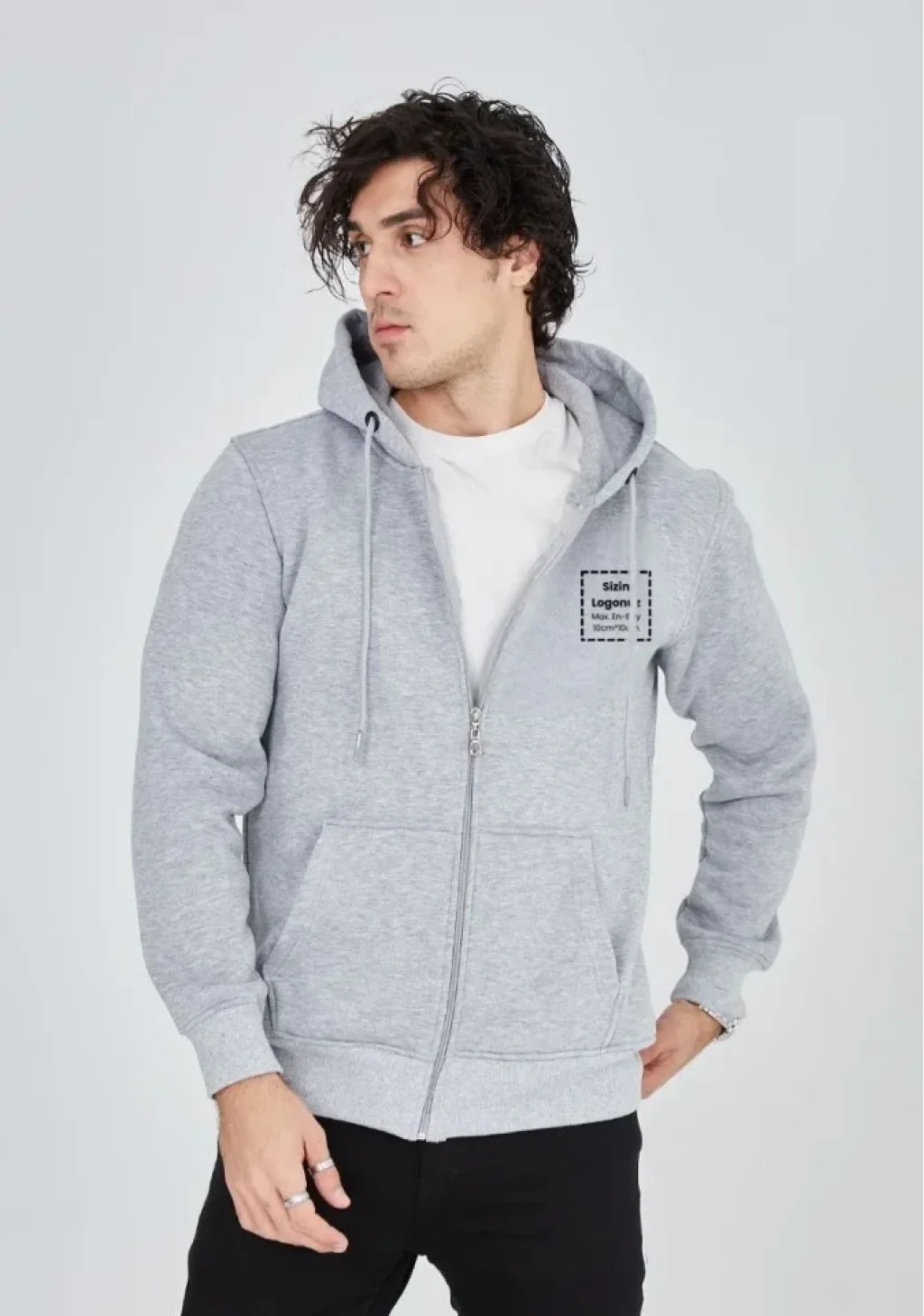 Unisex Tam Fermuarlı Kapşonlu Özel Tasarım SweatShirt - Gri