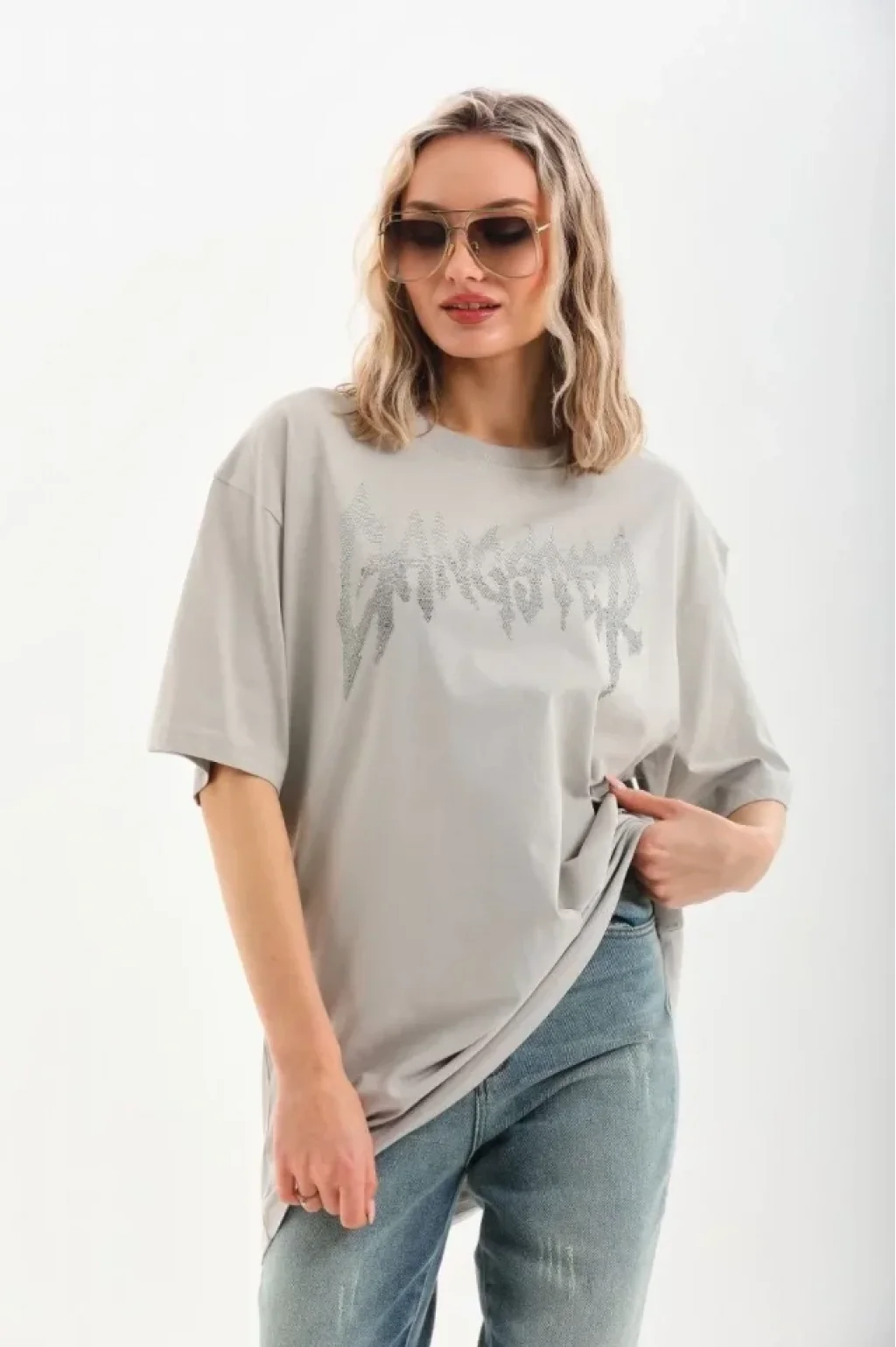 Unisex Taş Desenli Oversize T-Shirt - Gri