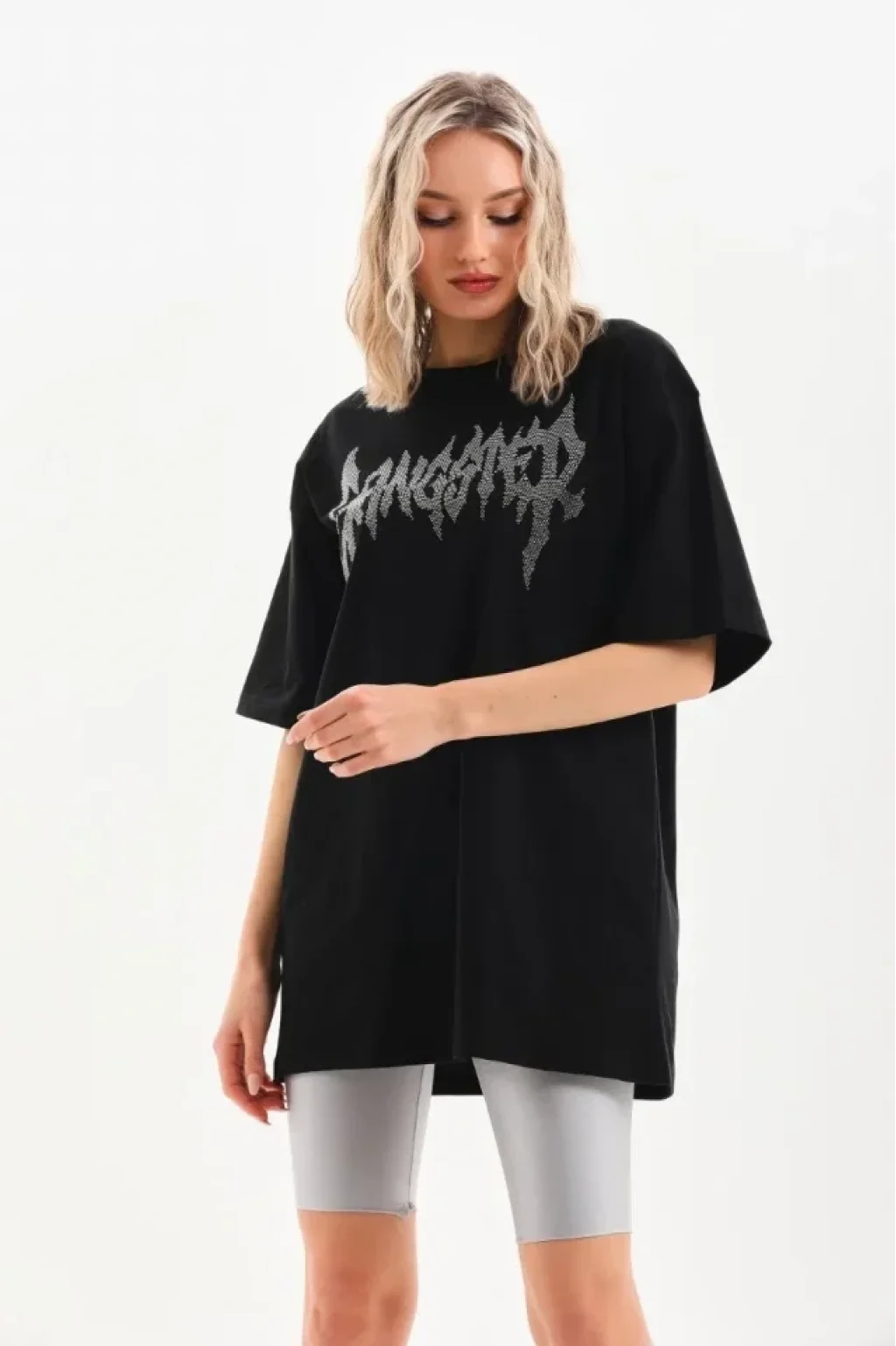 Unisex Taş Desenli Oversize T-Shirt - Siyah