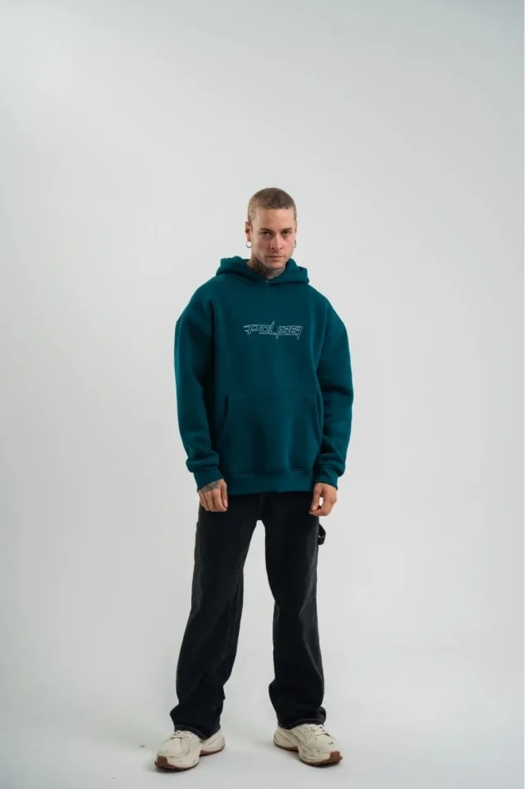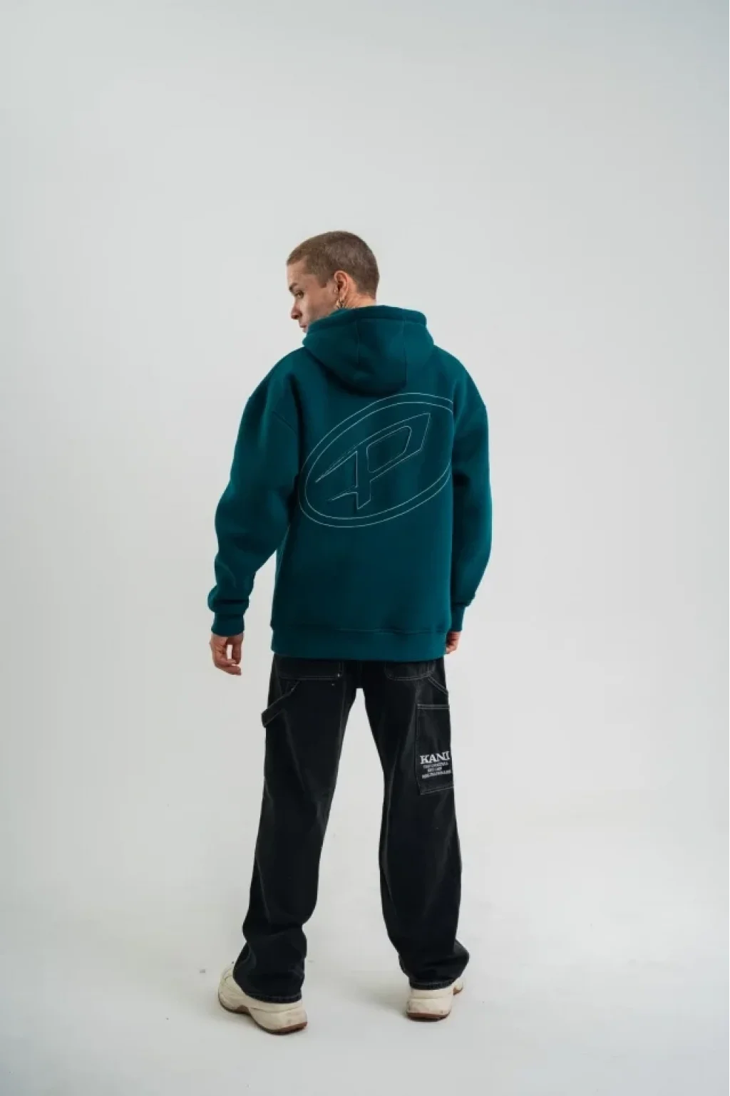 Unisex Üç İplik Kapşonlu Nakışlı SweatShirt - Koyu Deniz Yeşili