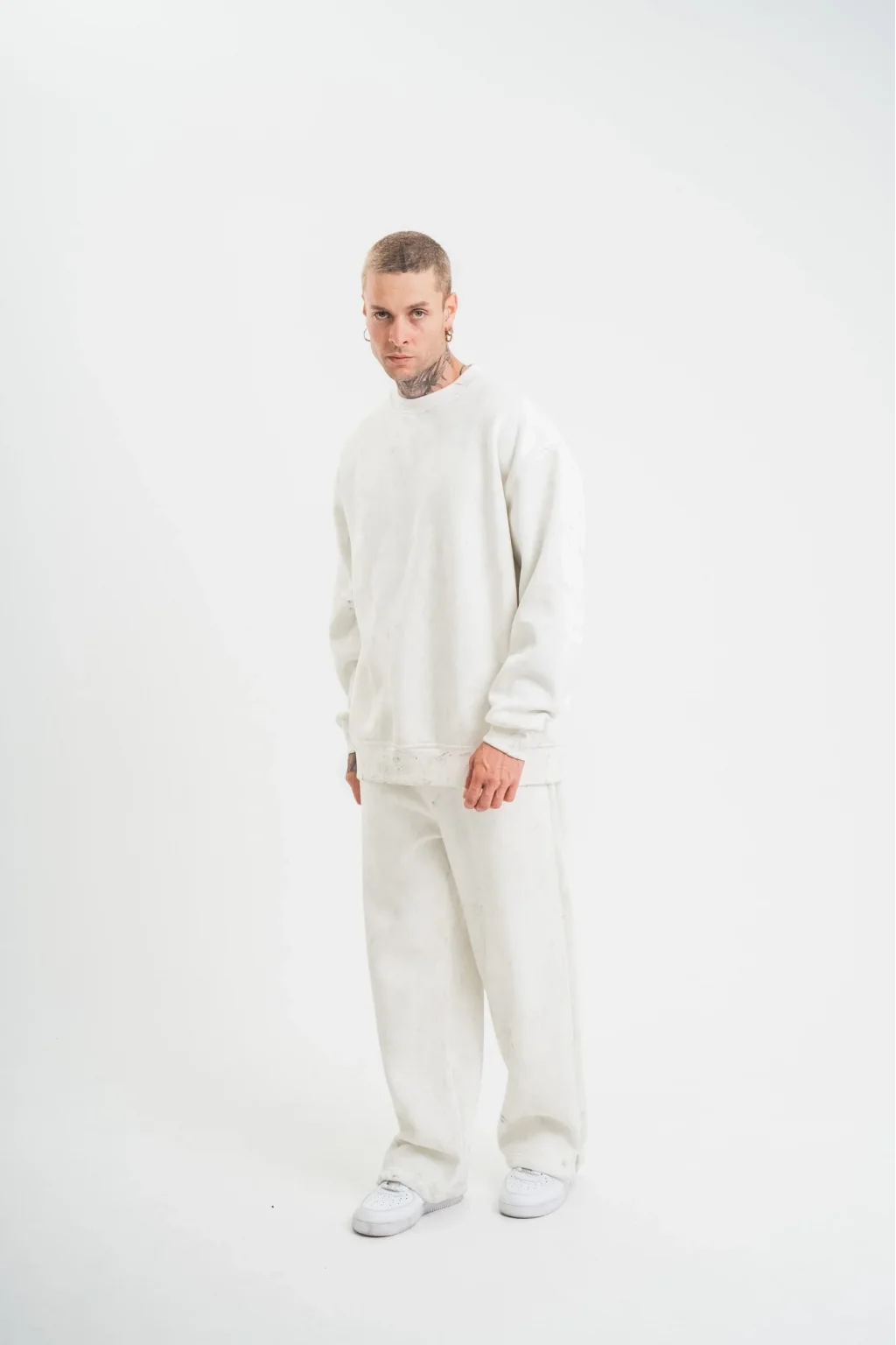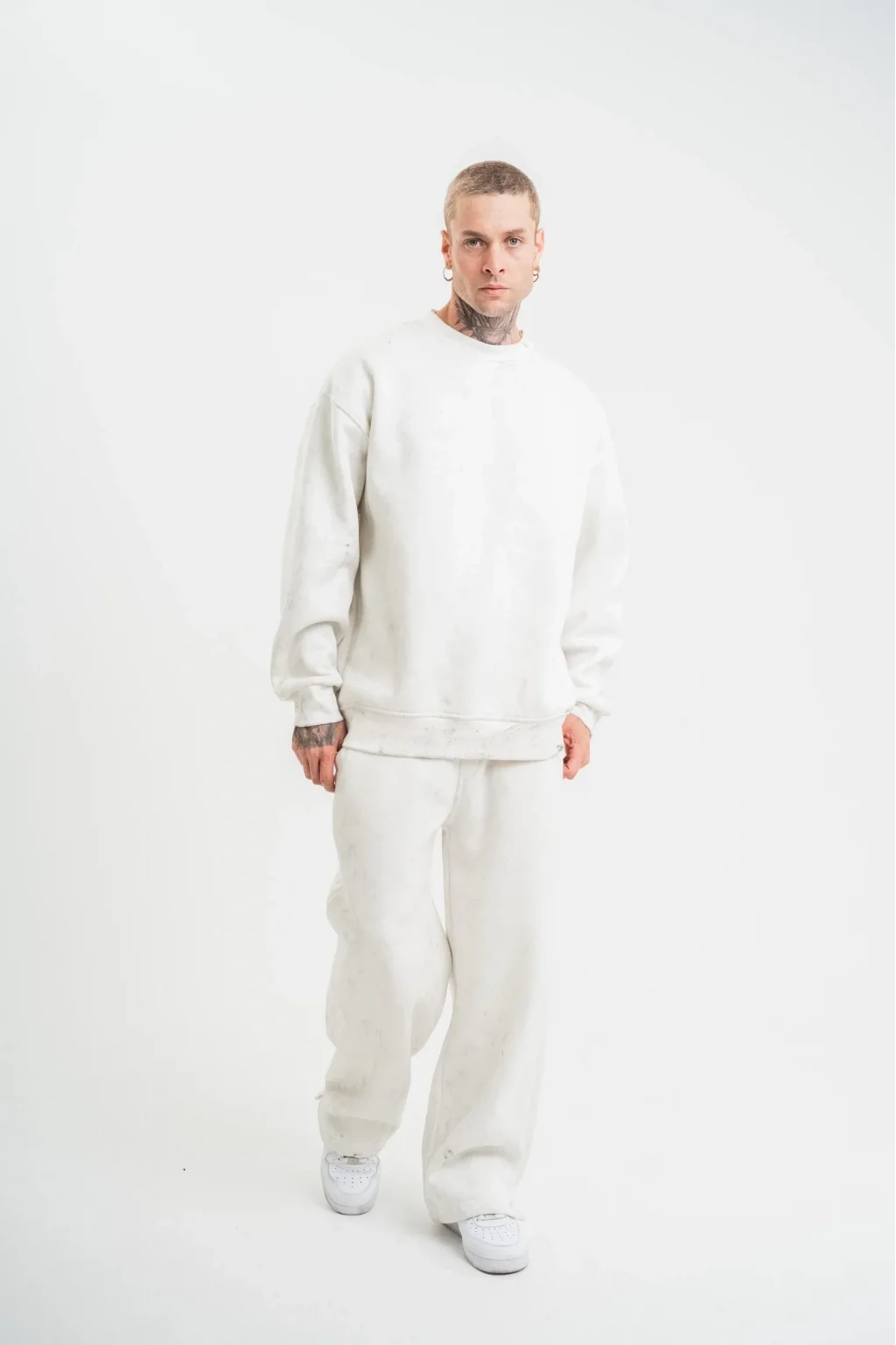 Unisex Uzun Kol Bisiklet Yaka Yıkamalı Eşofman Takım - Beyaz