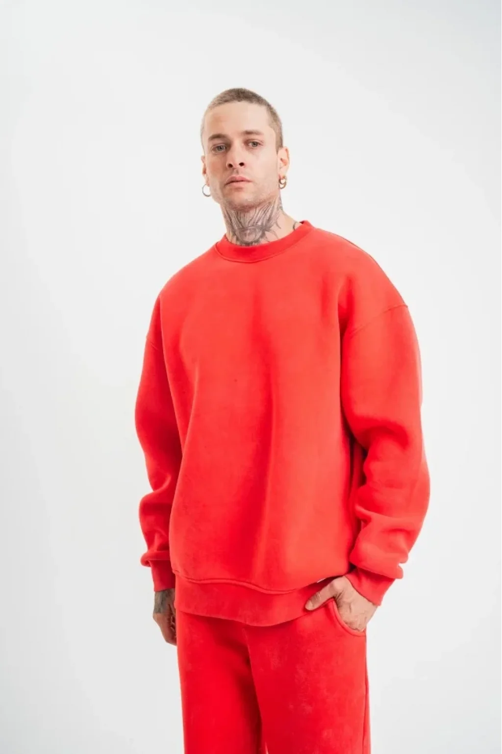 Unisex Uzun Kol Bisiklet Yaka Yıkamalı SweatShirt - Kırmızı