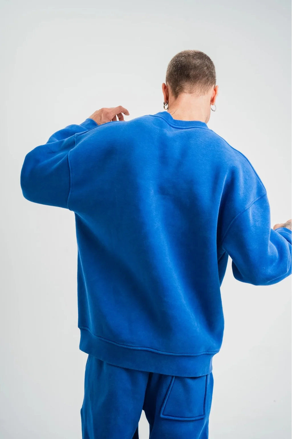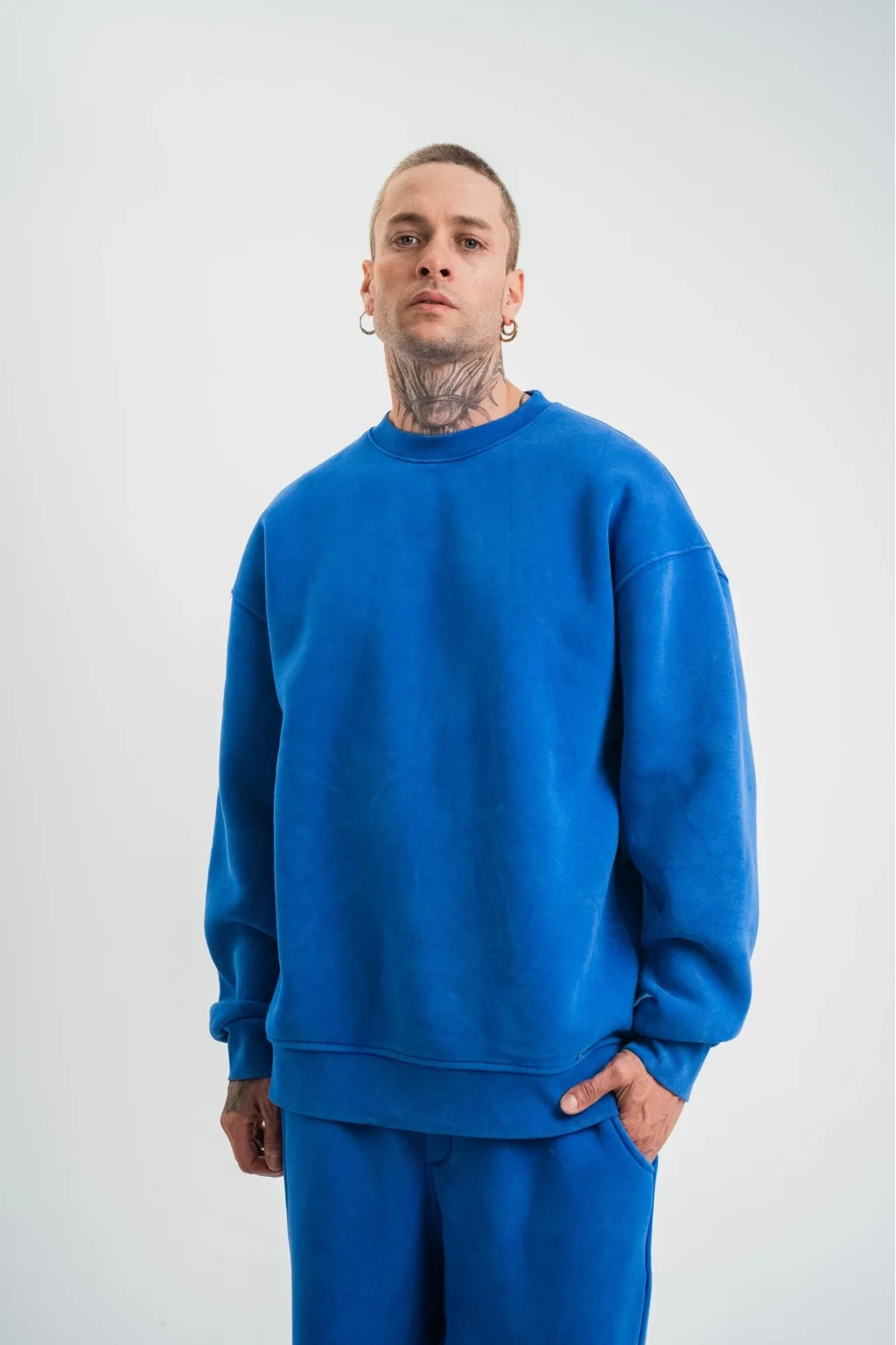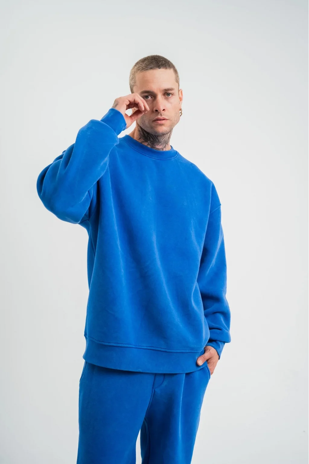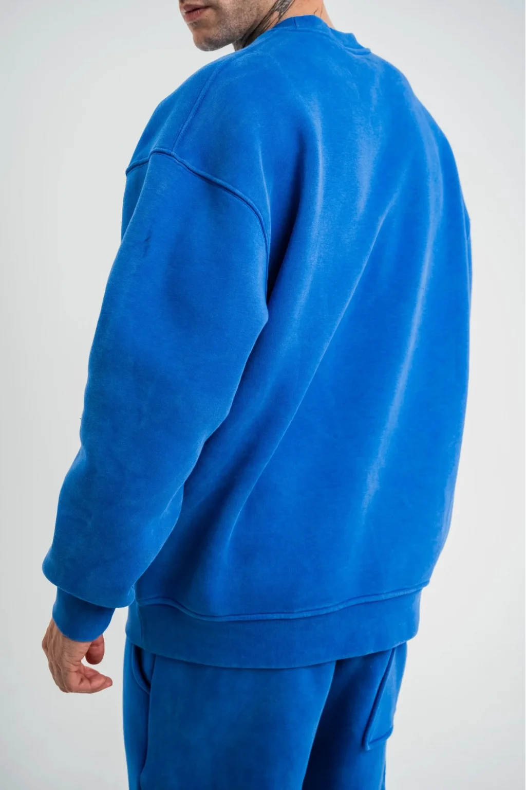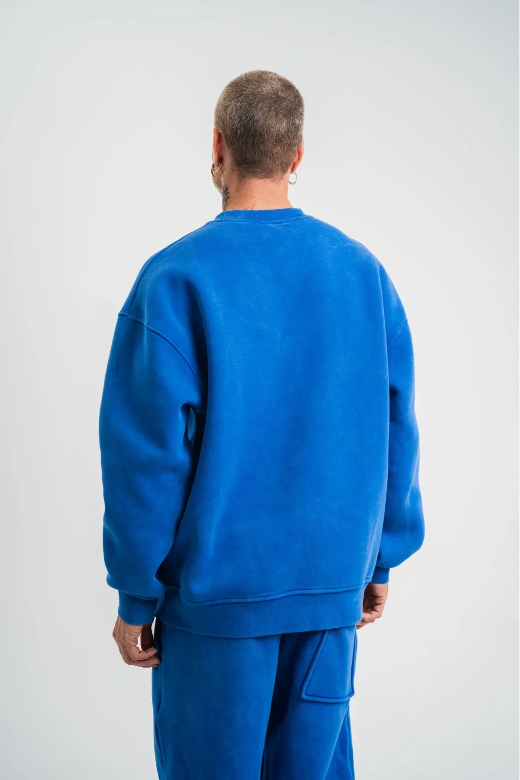 Unisex Uzun Kol Bisiklet Yaka Yıkamalı SweatShirt - Mavi