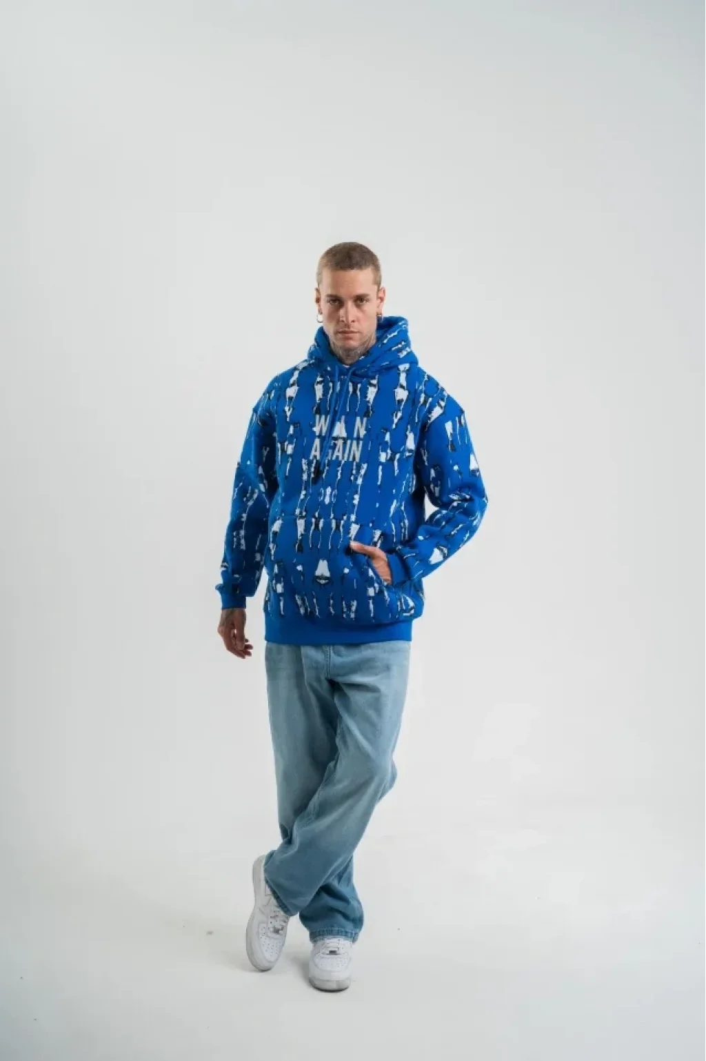 Unisex Uzun Kol Kapşonlu Pano Baskılı SweatShirt - Mavi