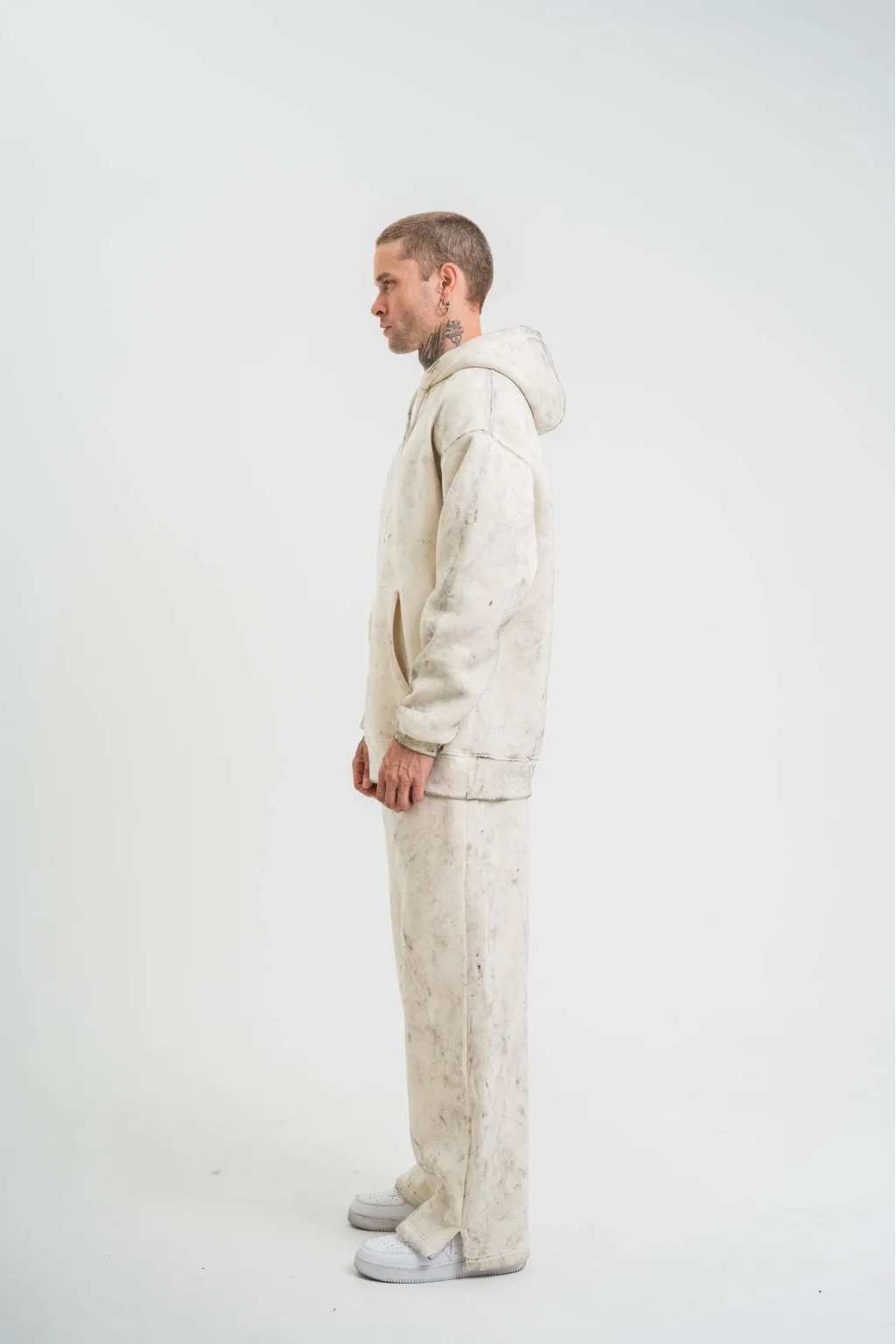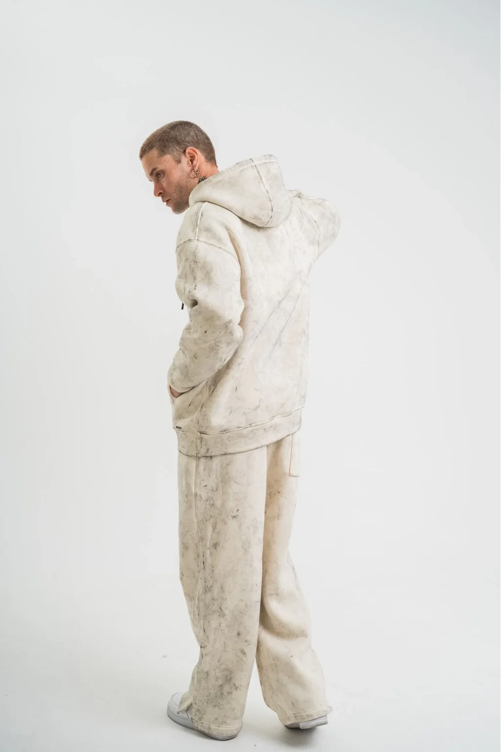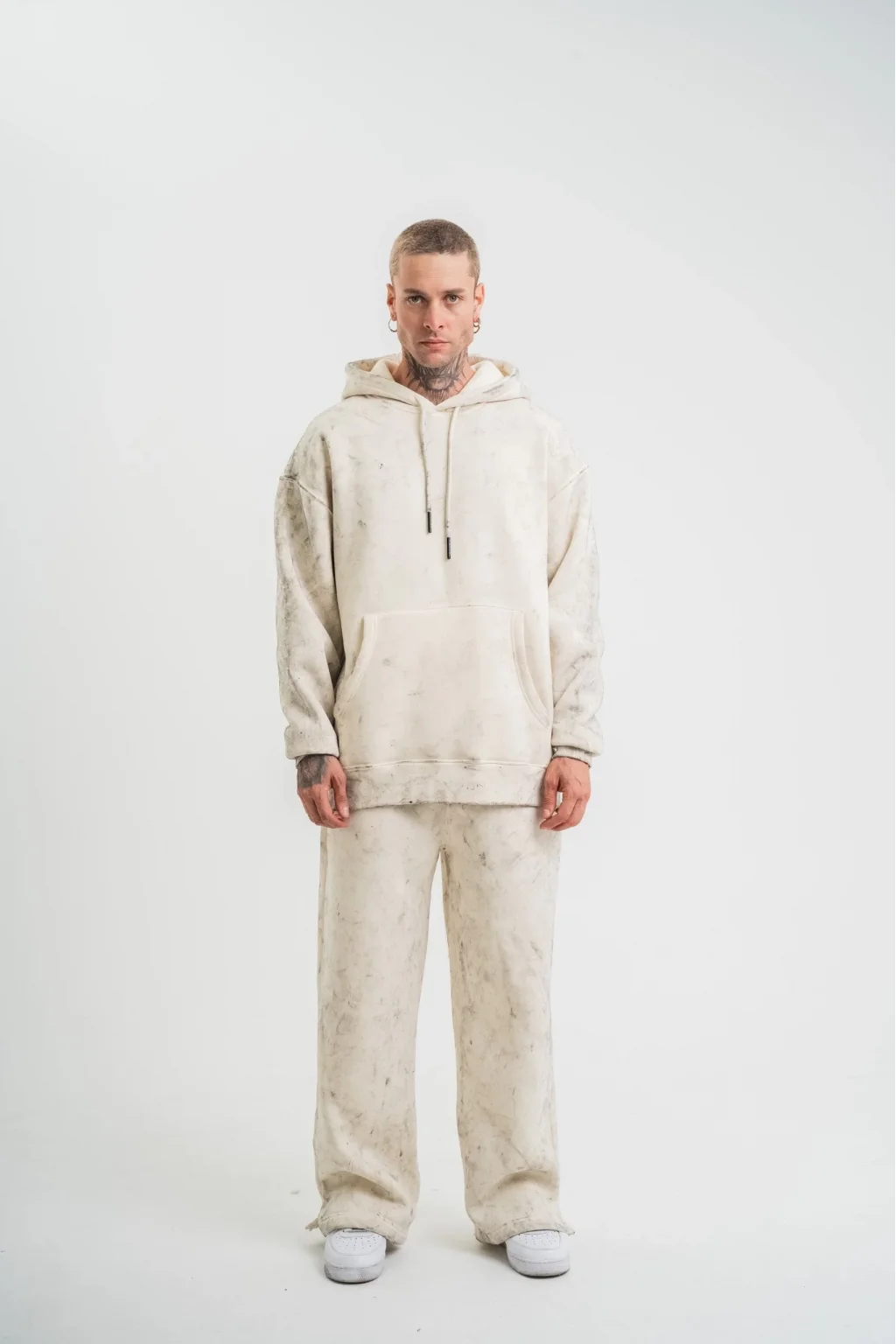 Unisex Uzun Kol Kapşonlu Yıkamalı Eşofman Takım - Krem