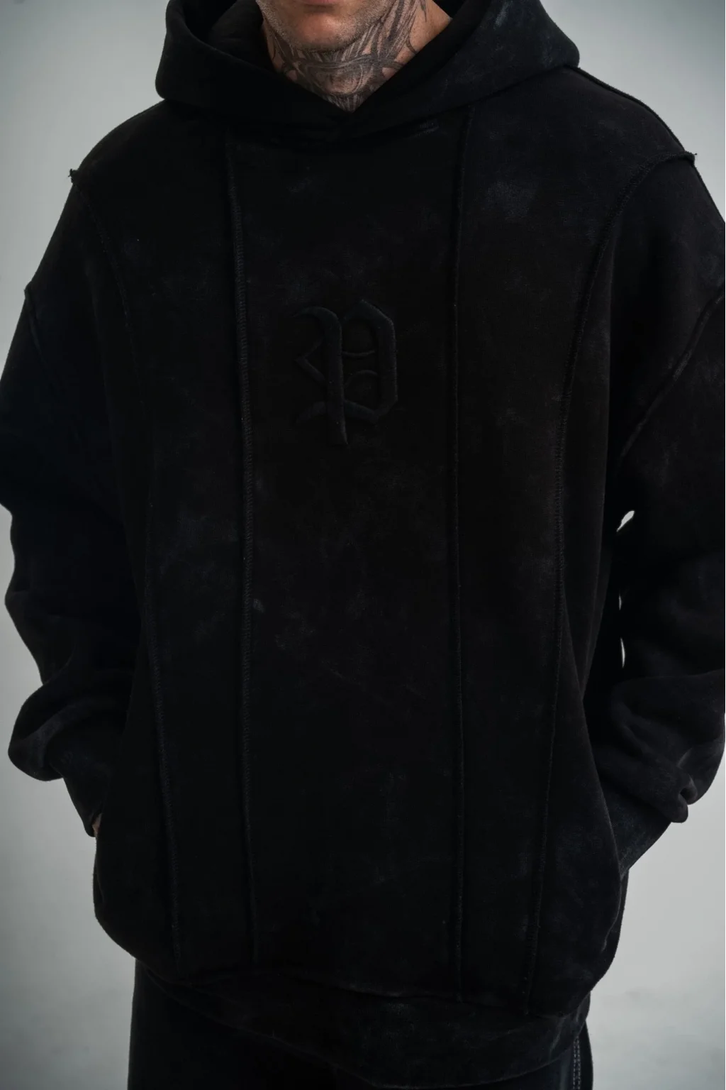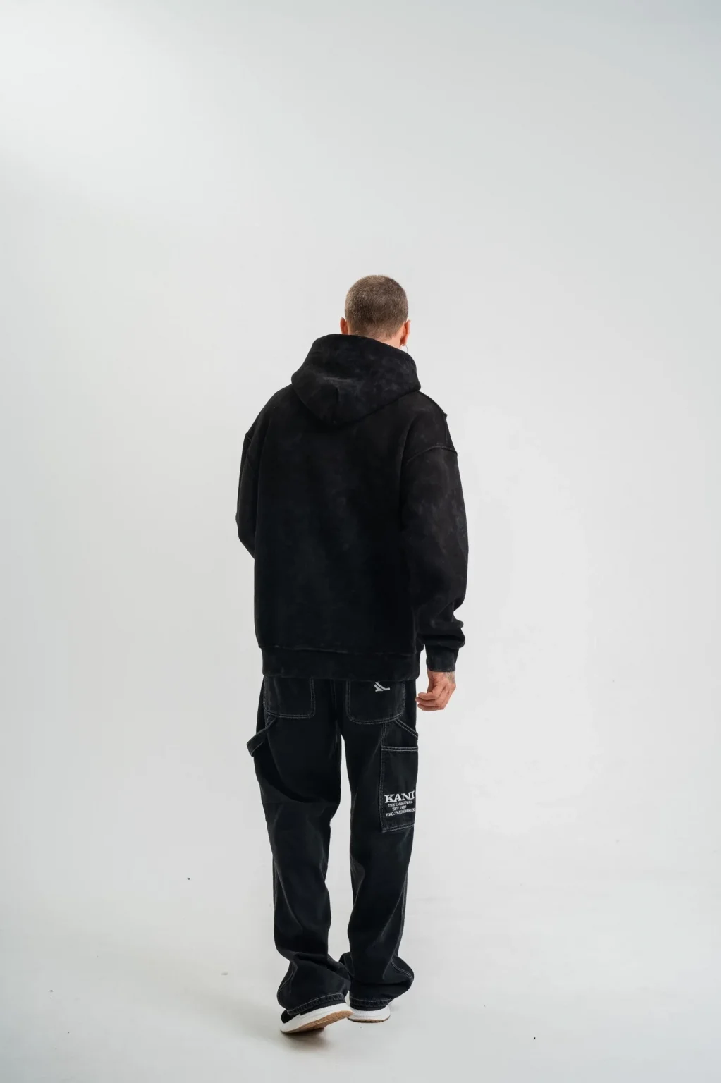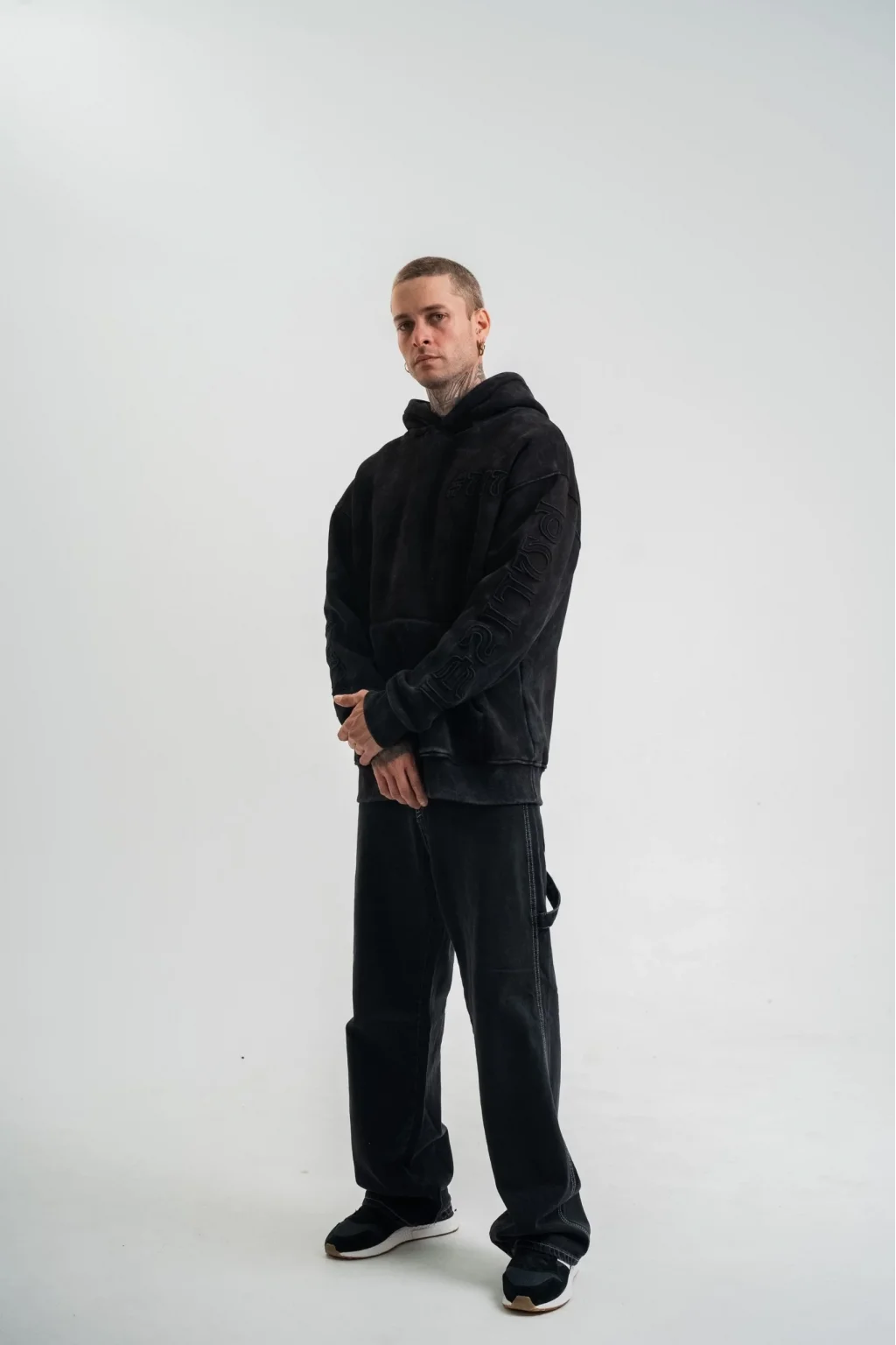 Unisex Uzun Kol Kapşonlu Yıkamalı Nakışlı SweatShirt - Siyah