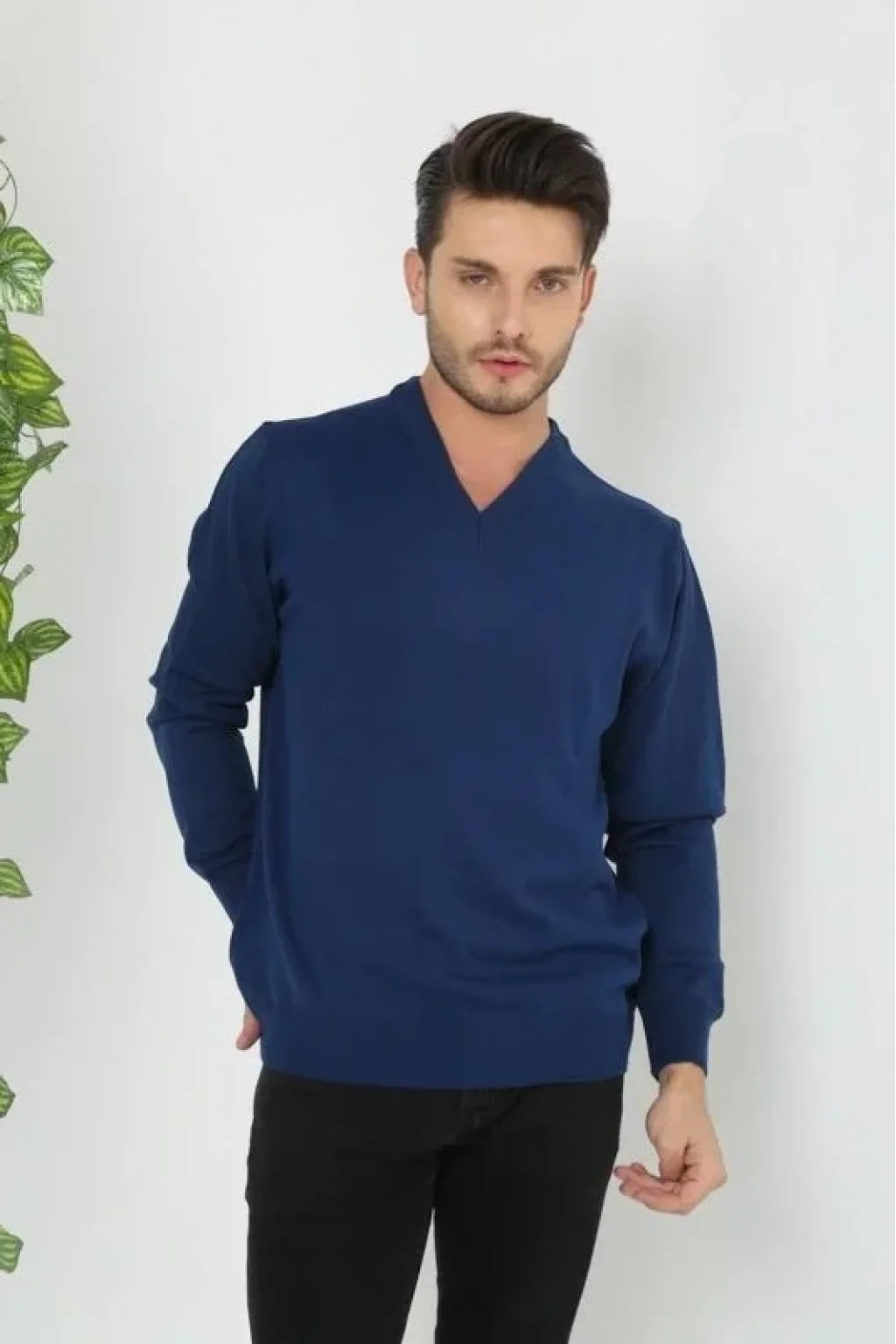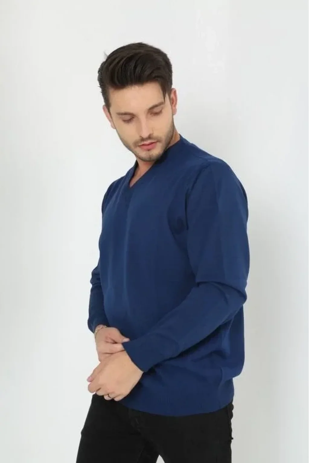 Unisex Uzun Kol V Yaka Triko Kazak - Indigo