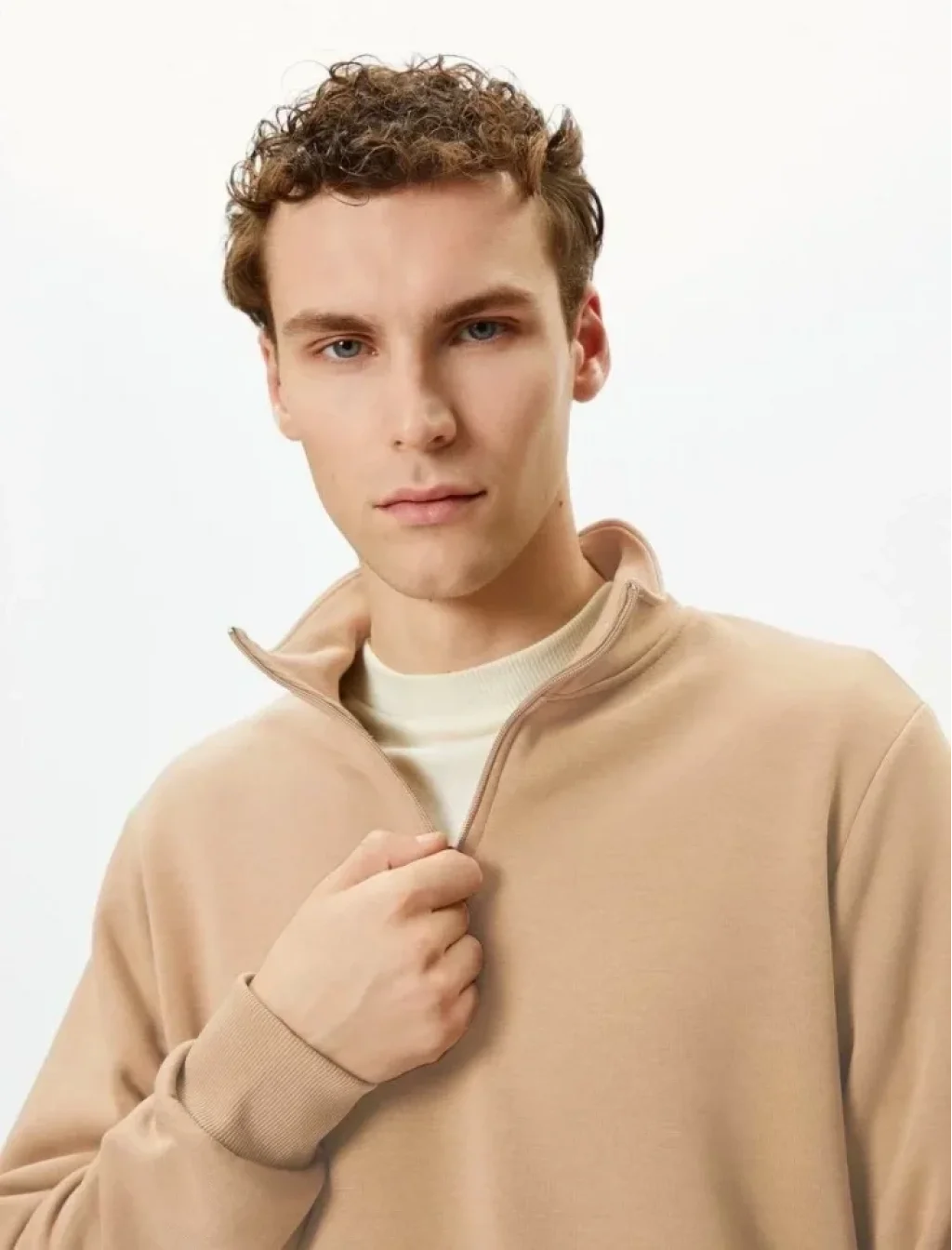Unisex Uzun Kol Yarım Farmuarlı Yakalı Basic SweatShirt - Bej