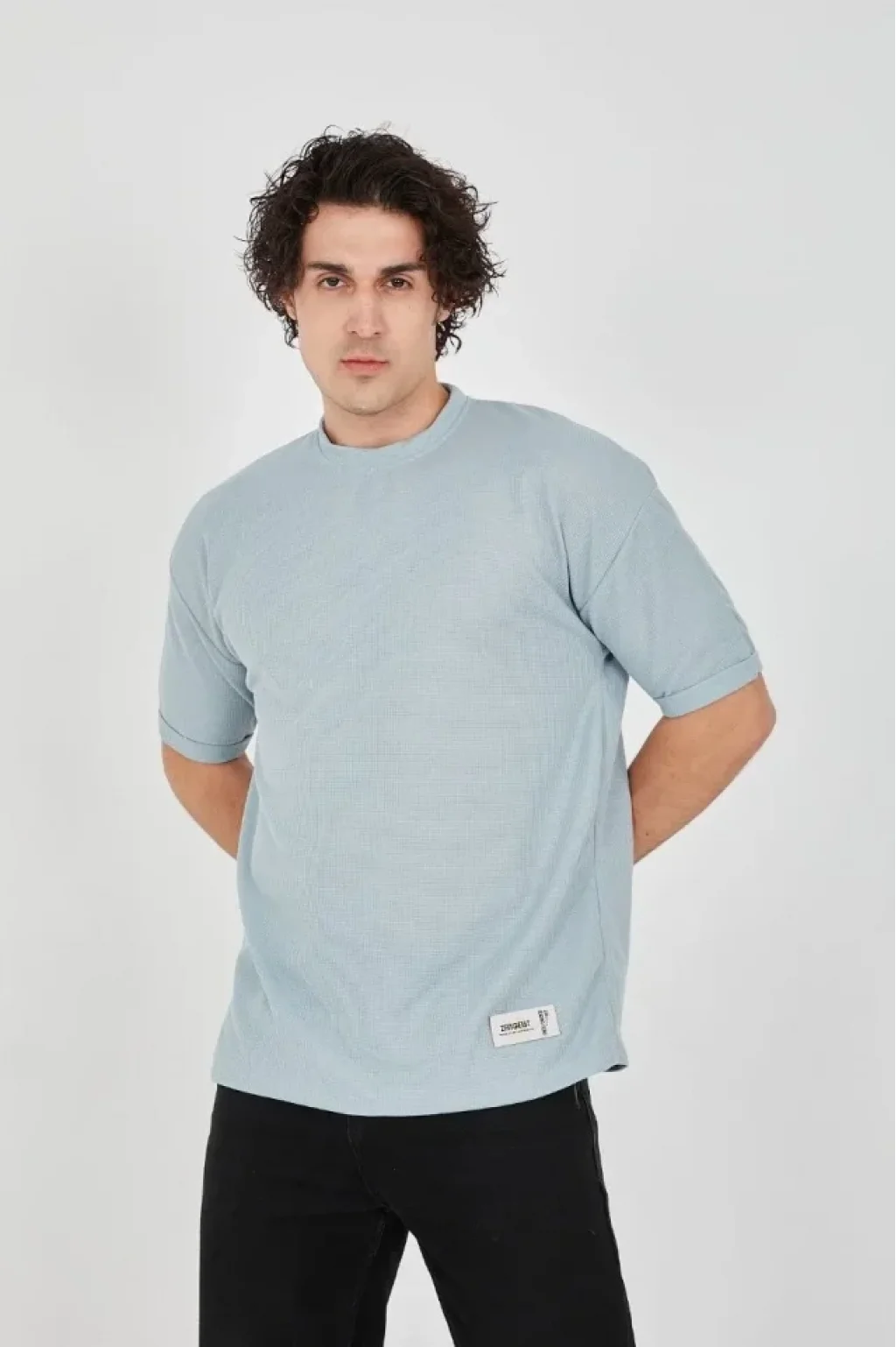 Unisex Waffle Kumaş Rahat Kol T-Shirt - Buz Mavisi