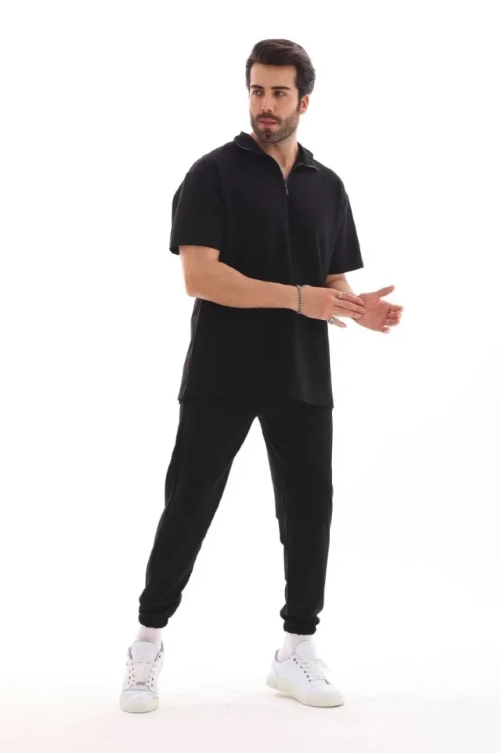 Unisex Yakalı Oversize T-Shirt Eşofmanlı Takım - Siyah
